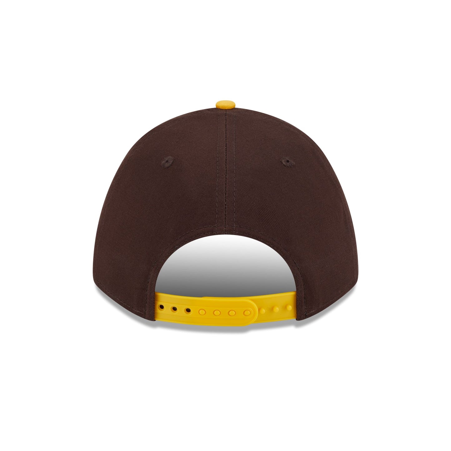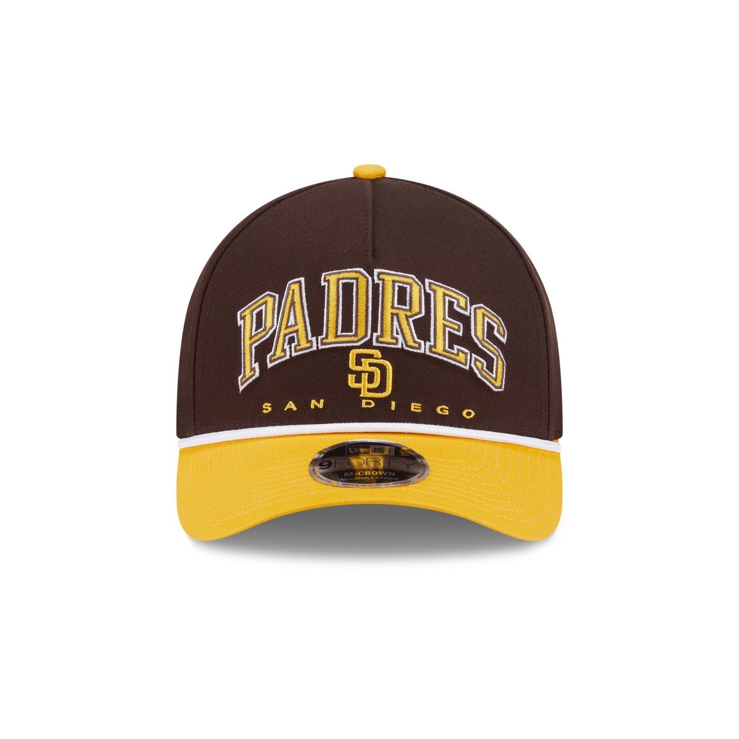 The San Diego Padres Arch 9FORTY M-Crown A-Frame Snapback features an embroidered Padres graphic at the front panels with a rope at the visor. Additional details include an adjustable snapback closure at the rear with a gray undervisor.