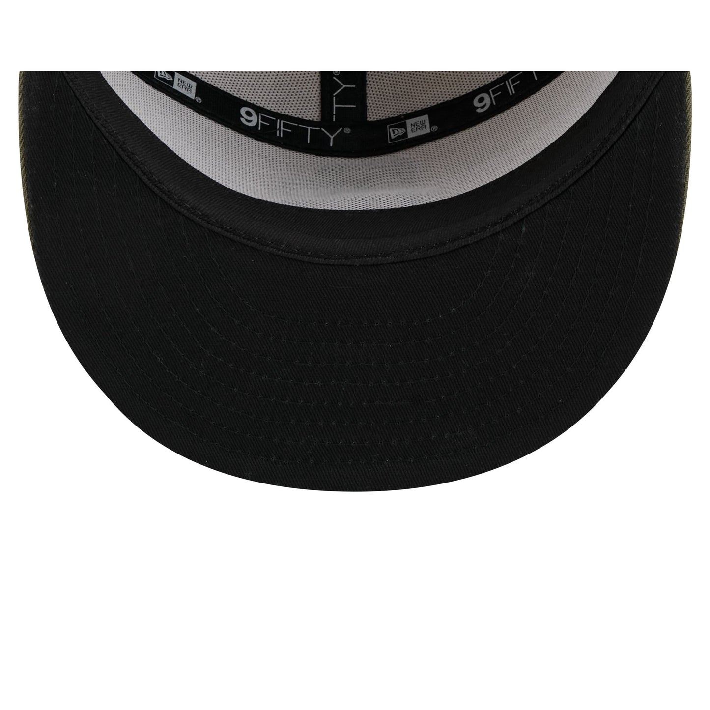 The San Diego Padres Armed Forces Day 2025 9FIFTY Split Panel Snapback features an embroidered Padres logo at the front panels against a split crown construction with the American Flag embroidered at the right-wear side. Additional details include an MLB Batterman logo above a snapback closure at the rear and a black undervisor.