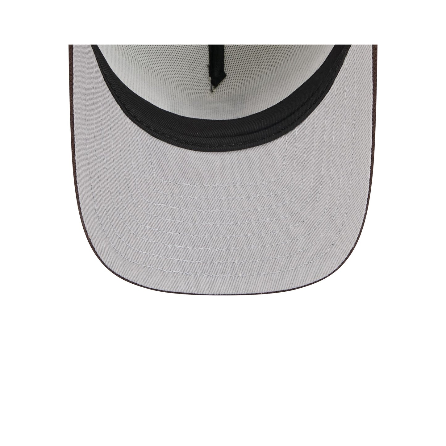 The San Diego Padres Banner 9FIFTY A-Frame Trucker features a embroidered Padres logo at the front panels against a screen-printed stripe at the front panels. Additional details include a snapback closure at a mesh rear and a gray undervisor.