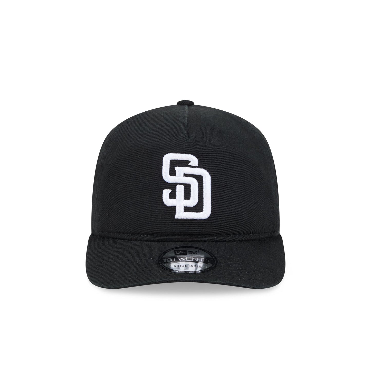 The San Diego Padres Black and White 19TWENTY Snapback features an embroidered Padres logo at the front with a snapback closure at the rear and a gray undervisor.