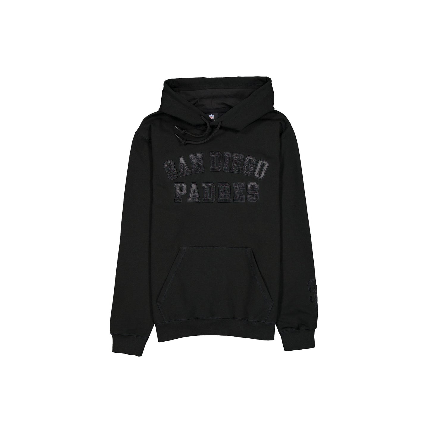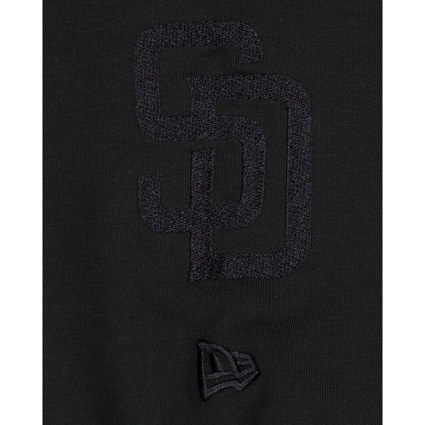 The San Diego Padres Black on Black Logo Select Hoodie features a satin applique with a tonal stitch Padres wordmark at the chest and an embroidered team logo at the left-wear sleeve.