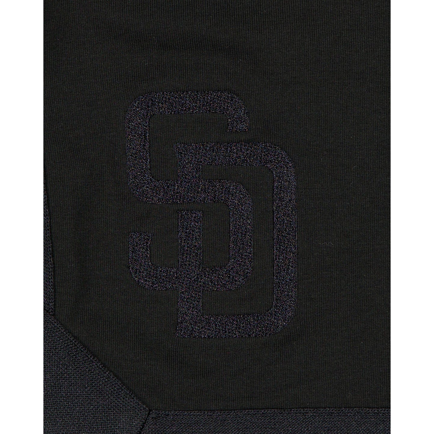 The San Diego Padres Black on Black Logo Select Shorts features an embroidered Padres logo at the right-wear leg and a satin applique with a tonal stitch team wordmark at the rear left leg.