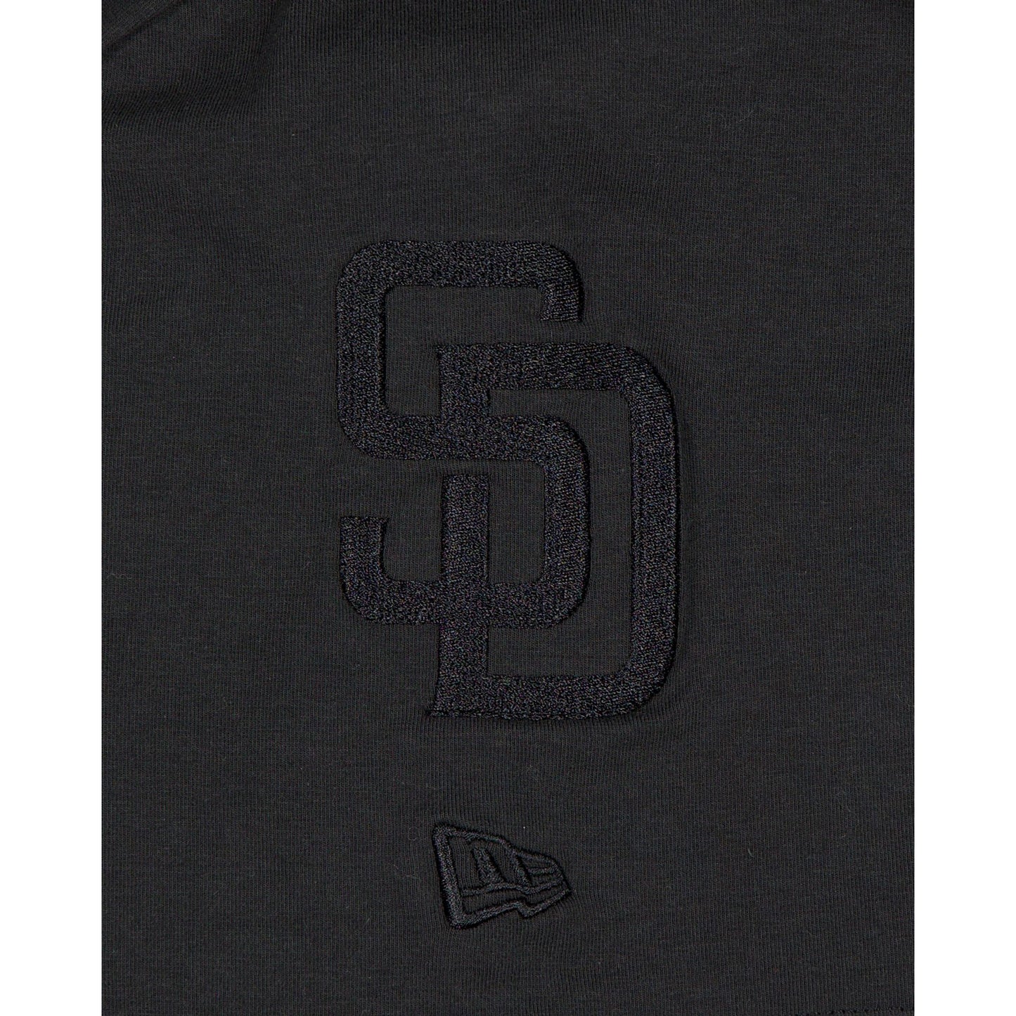 The San Diego Padres Black on Black Logo Select T-Shirt features a satin applique with a tonal stitch Padres wordmark at the chest and an embroidered team logo at the left-wear sleeve.