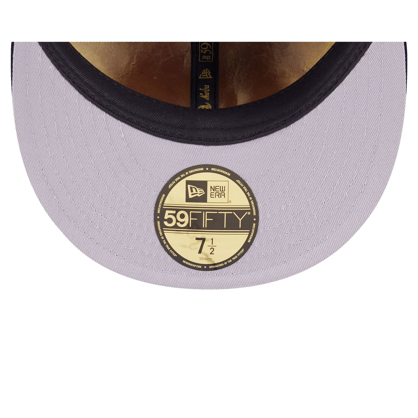 The San Diego Padres Black Velvet 59FIFTY Fitted Cap features an embroidered Padres wordmark at the front panels against a velvet fabrication throughout. Additional details include a metal plate hand stitched at the rear and a gray undervisor.