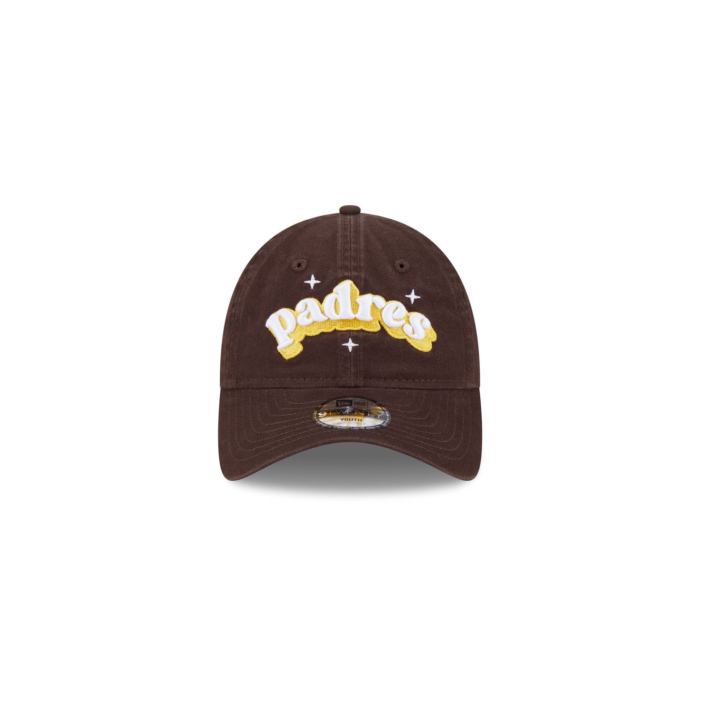 The San Diego Padres Cheer Kids 9TWENTY Adjustable Cap features an embroidered San Diego Padres sparkle wordmark at the front panels. Additional details include a logo at the right-wear side and an adjustable D-Ring closure at the rear and a gray undervisor.
