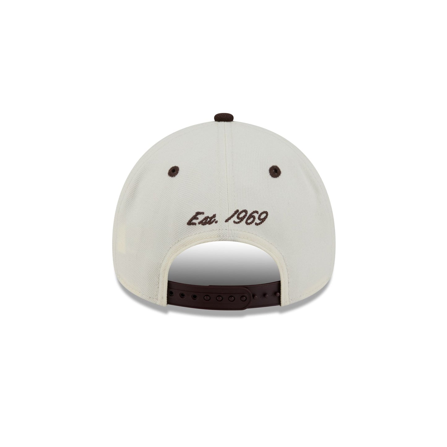 The San Diego Padres Chrome White Arched 9FORTY A-Frame Snapback features an embroidered Padres arched logo graphic at the front panels with a team graphic at the right-wear side. Additional details include the establishment date above an adjustable snapback closure at the rear and a gray undervisor.