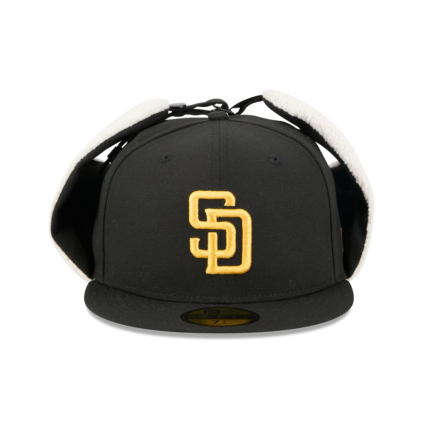 The San Diego Padres Classic Dog Ear 59FIFTY Fitted Cap features an embroidered Padres logo at the front panels with sherpa ear covers with a snap button closure. Additional details include the MLB Batterman logo at the rear and a gray undervisor.