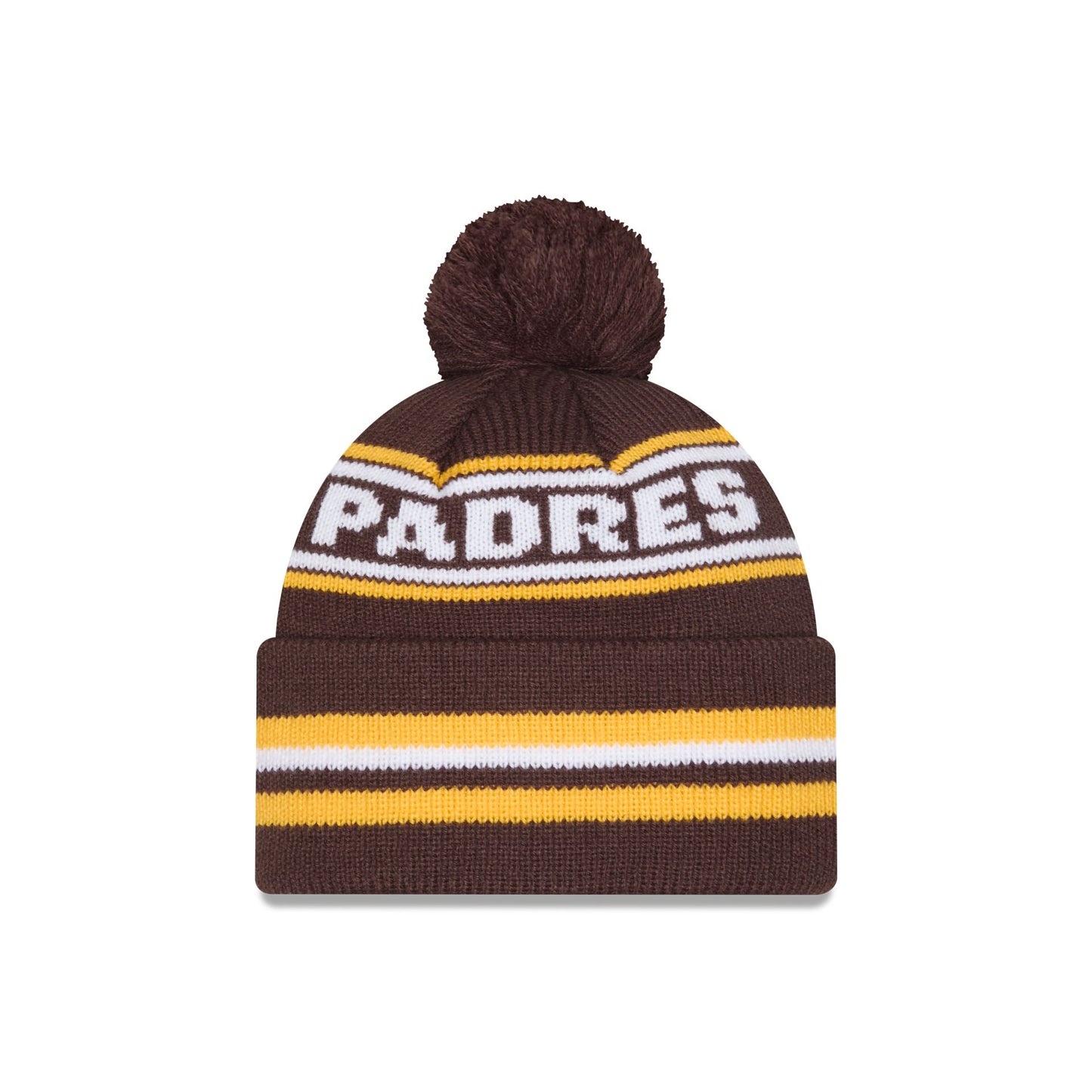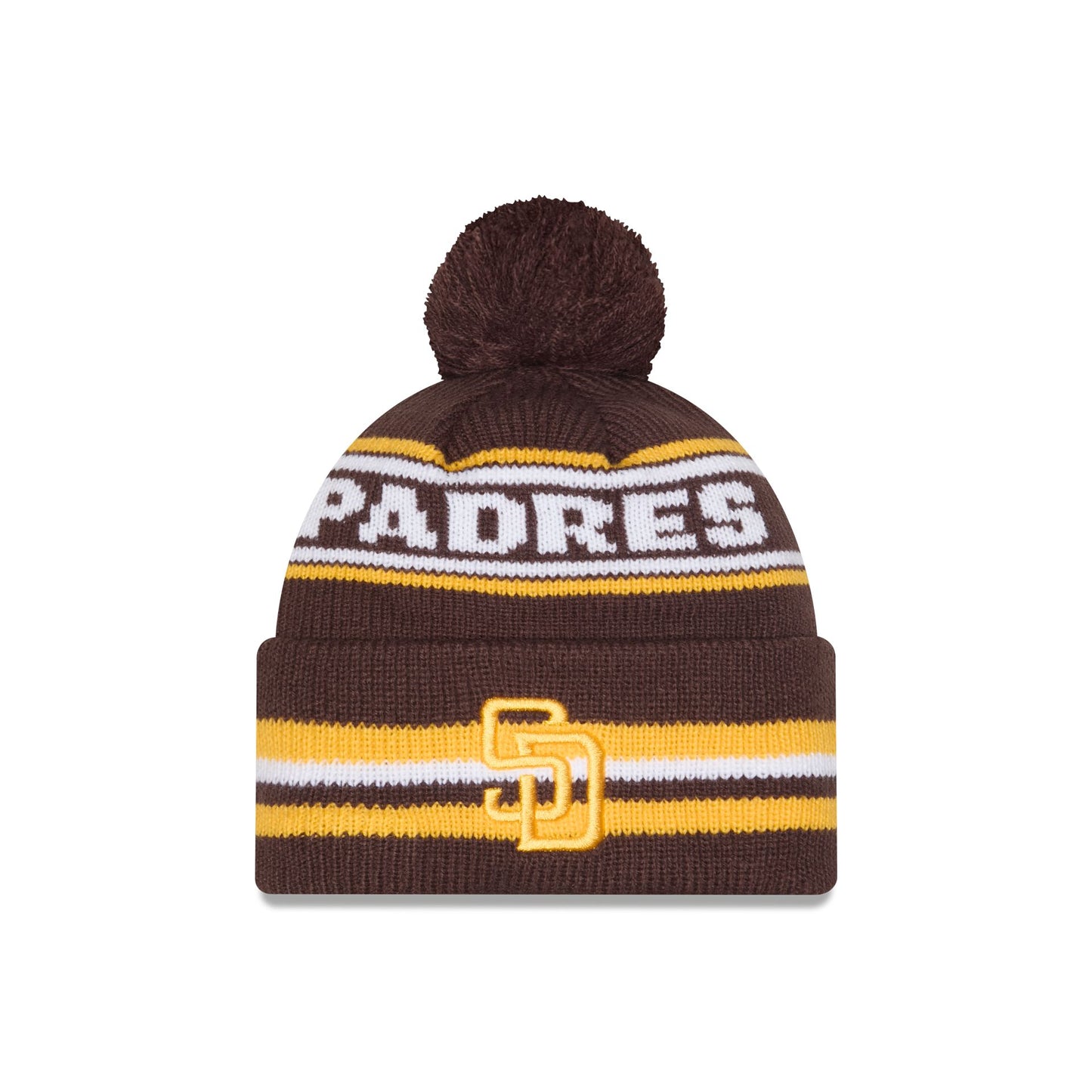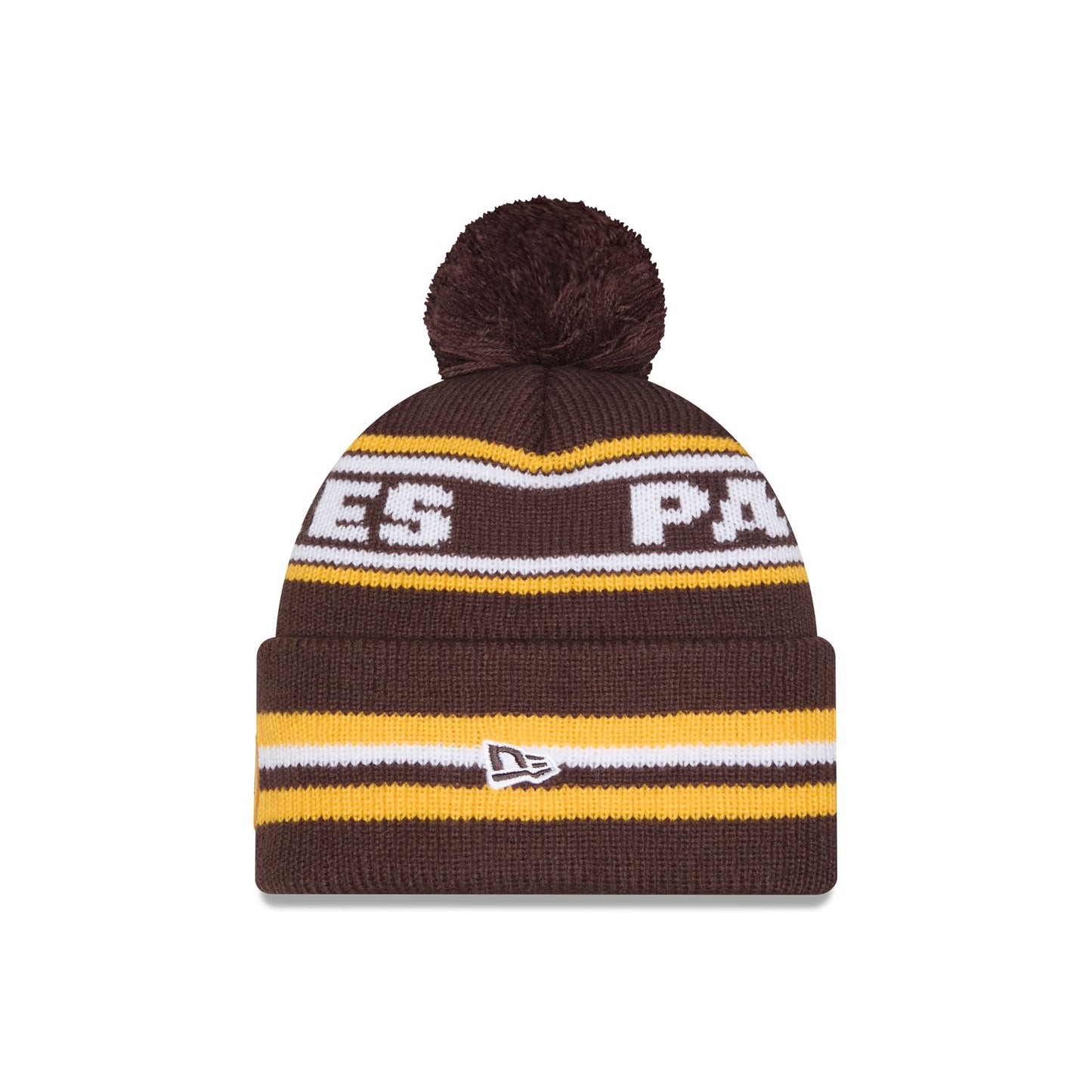 The San Diego Padres Classic Pom Knit Hat features an embroidered Padres logo at the front cuff with a wordmark at the crown and a one-time removable pom.