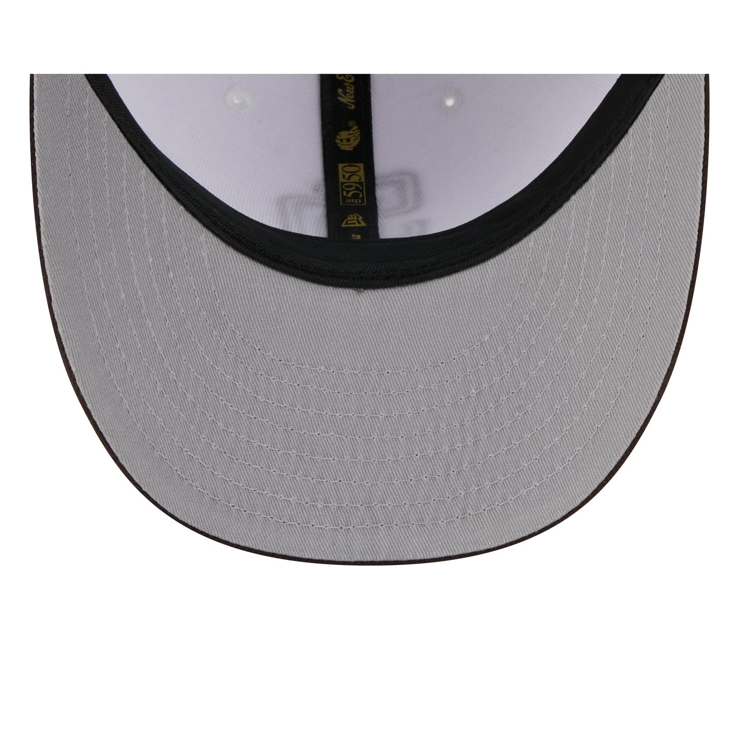 The San Diego Padres Floral Shine Low Profile 59FIFTY Fitted Cap features an embroidered Padres logo at the front panels with a matching MLB Batterman logo at the rear. Additional details include a satin fabrication throughout the cap and a gray undervisor. This cap has a pre-curved visor.