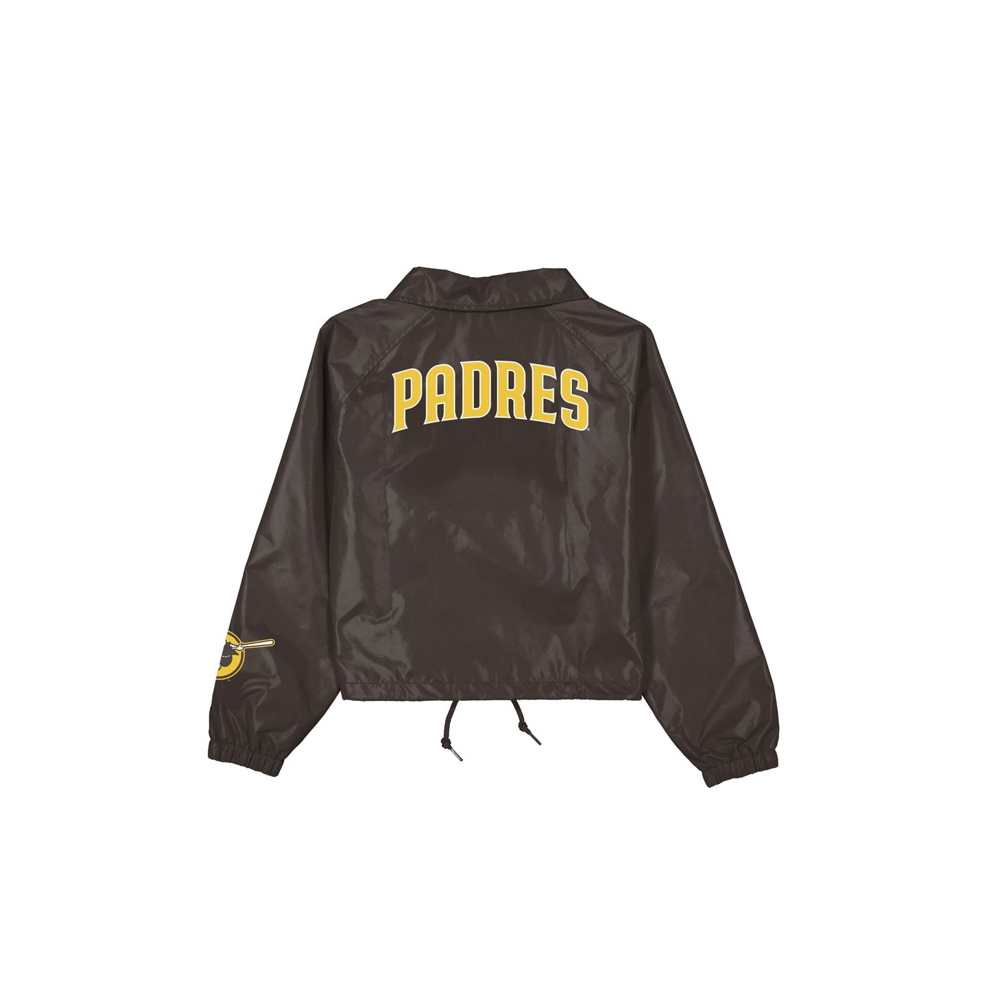 The San Diego Padres Game Day Classic Women's Jacket features a screen-printed Padres logo at the left chest, a wordmark at the rear, and a logo at the left wrist. Additional details include front pockets, a snap button closure, and adjustable drawstrings at the waist.