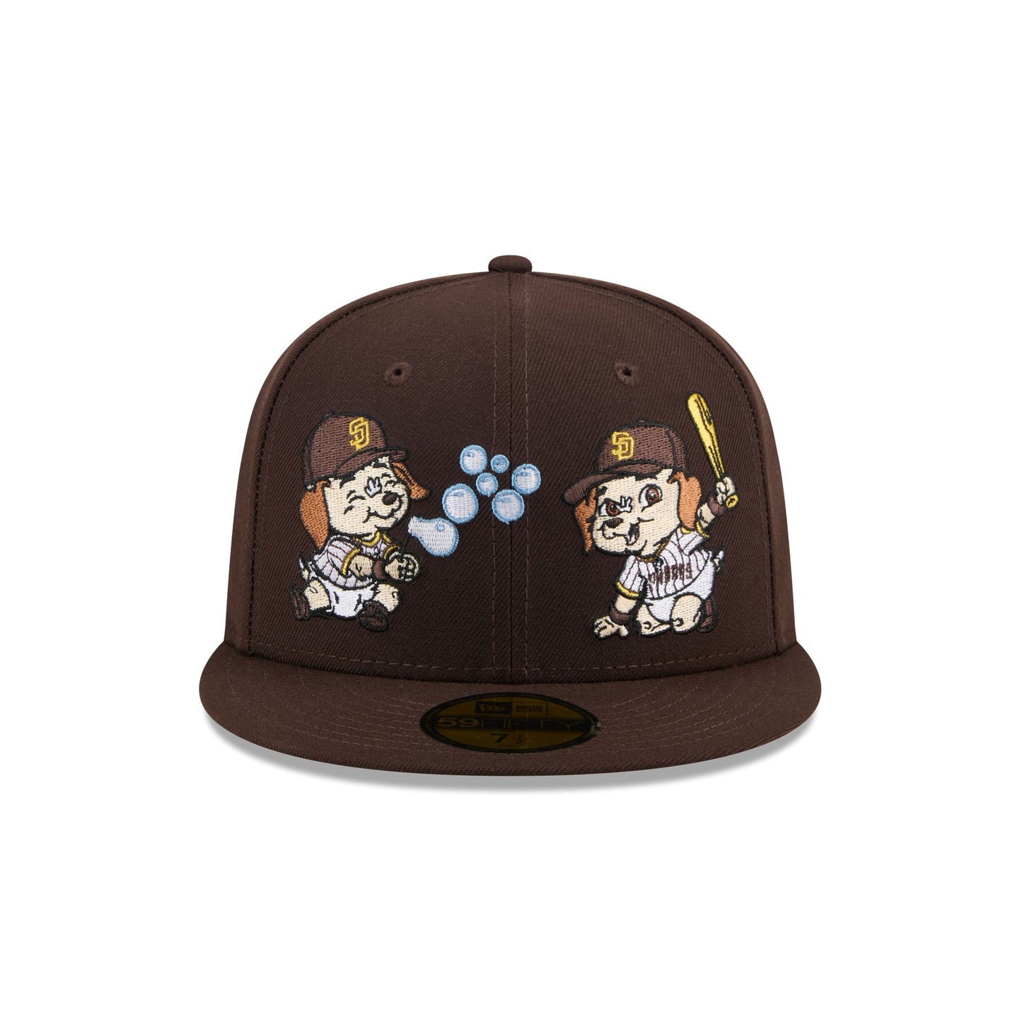 The San Diego Padres Generation Mascots 59FIFTY Fitted features an embroidered Padres baby mascots at the front panels. Additional details include a team logo at the rear and a gray undervisor.
