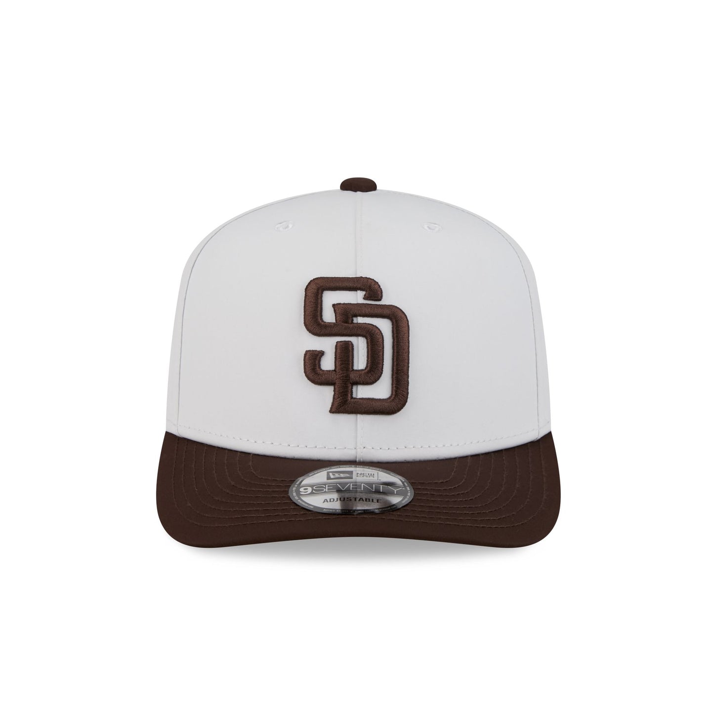 The San Diego Padres GORE-TEX White 9SEVENTY Stretch-Snap features an embroidered Padres logo at the front panels with a metallic sheen silicone New Era Flag logo and GORE-TEX logo at the left-wear side. Additional details include an adjustable snapback closure at the rear, a gray undervisor, and a polyester fabrication throughout the cap. It is waterproof, breathable, and lightweight.