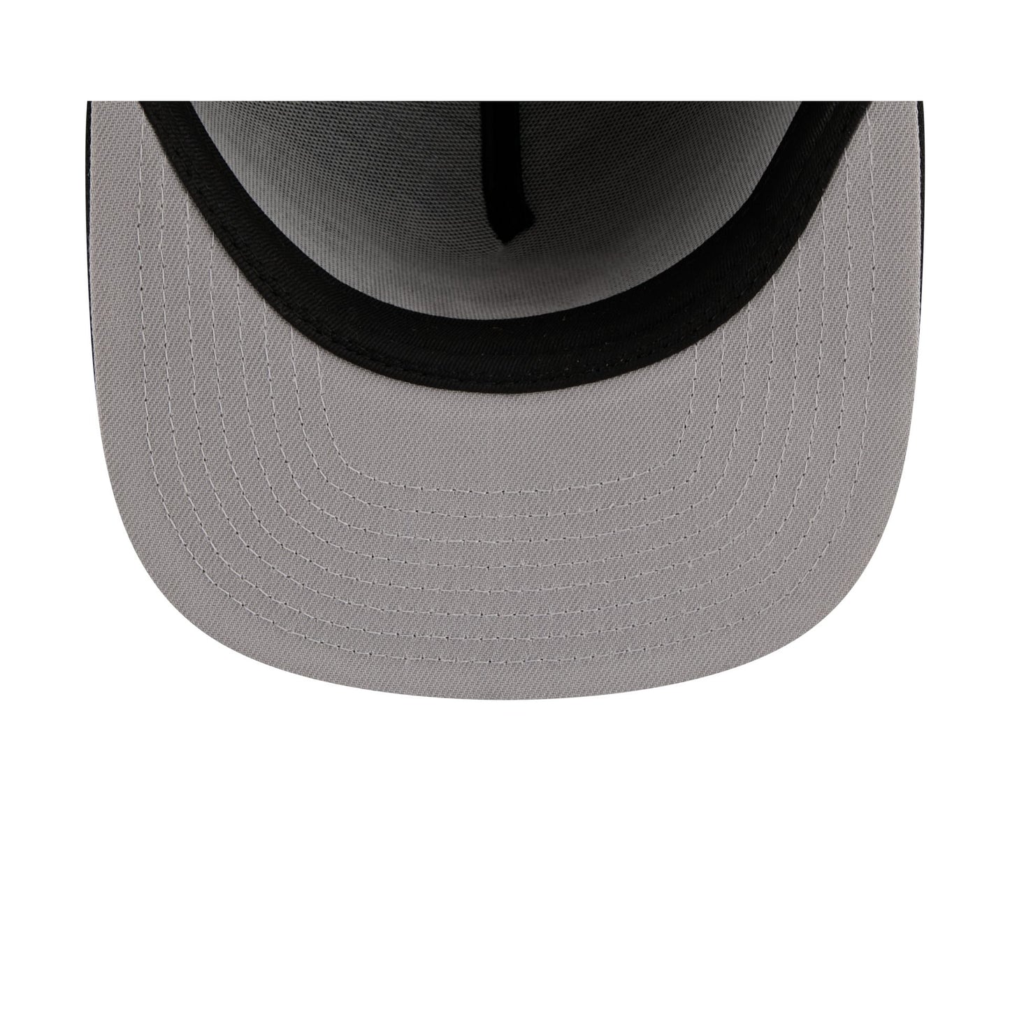 The San Diego Padres Grunge Plaid 9FIFTY A-Frame Adjustable Cap features an embroidered Padres logo at the front panel with an alternative logo above an adjustable metal clasp closure at the rear, a black visor, and a gray undervisor.