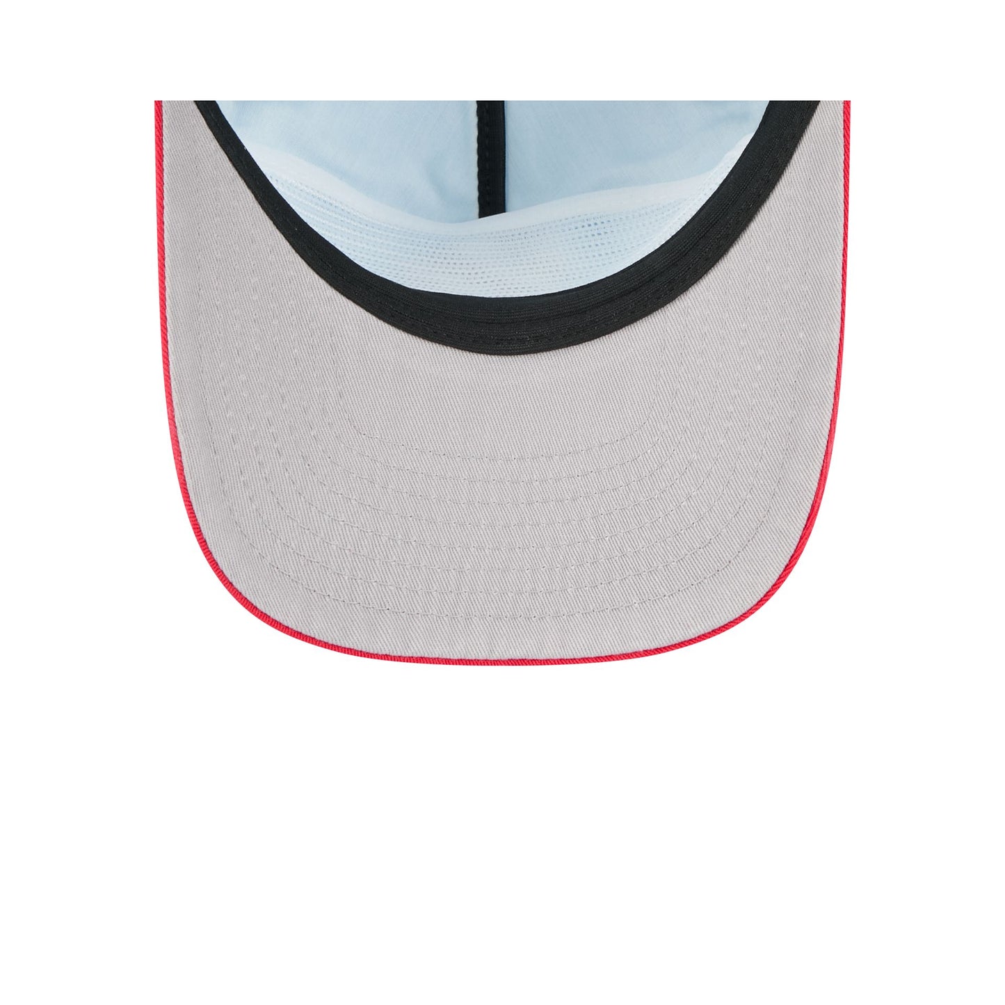 The San Diego Padres Independence Day 2025 Golfer features an embroidered American flag themed Padres logo at the front panels with a matching MLB Batterman logo above a snapback closure at the rear, a red visor, and a gray undervisor.