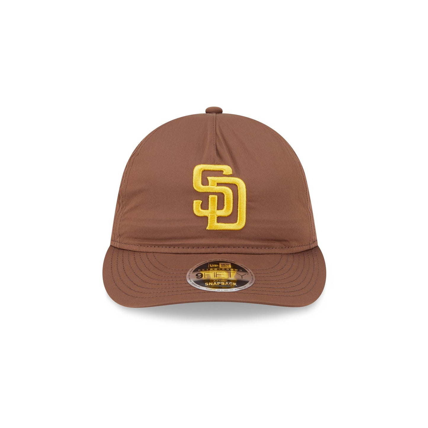 The San Diego Padres Nylon Retro Crown 9FIFTY A-Frame Snapback features an embroidered Padres logo at the front panels with a 1998 World Series patch at the right-wear side, a snapback closure at the rear, and a green undervisor.
