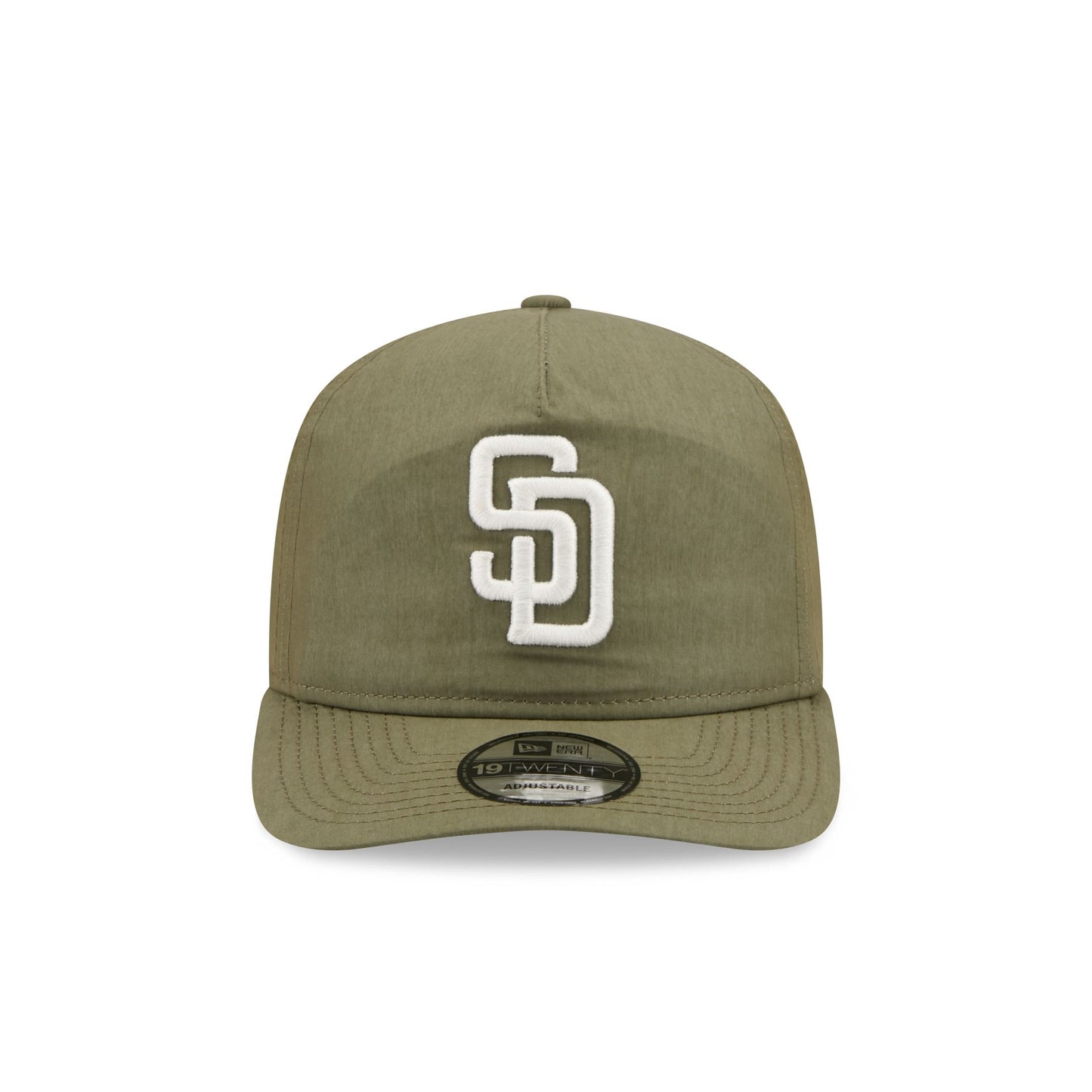 The San Diego Padres Olive Green Nylon 19TWENTY Adjustable Cap features an embroidered Padres white logo at the front panels with an adjustable snapback closure at the rear and a gray undervisor.