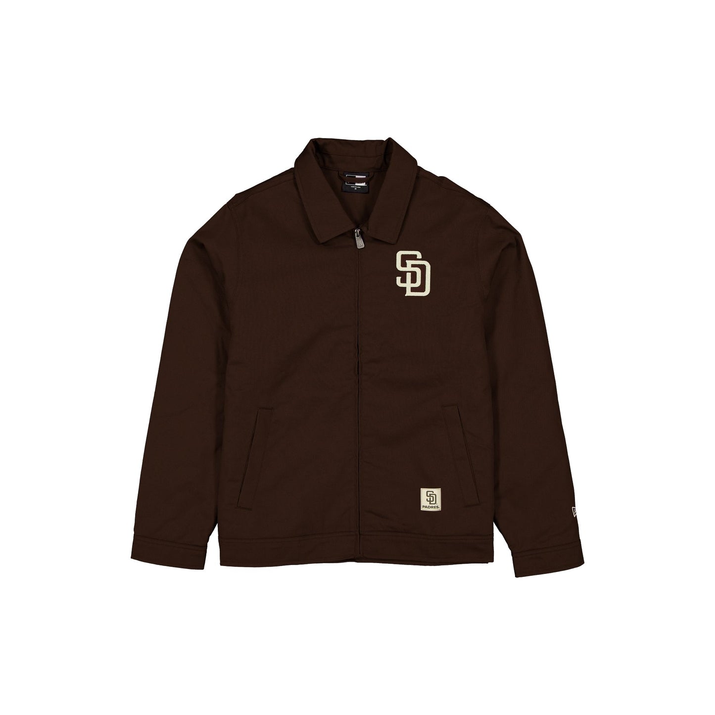 The San Diego Padres Quilted Jacket features a chain stitch embroidered Padres logo at the left chest with a matching team jock tag at the left slit pocket. Additional details include a full-zip closure with an interior pocket at the chest and adjustable snap button straps at the rear hem.