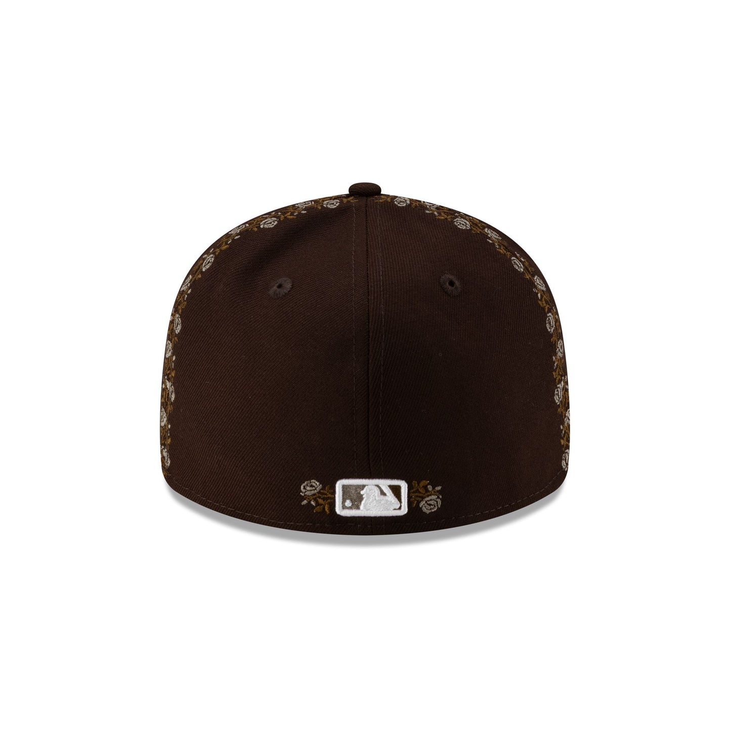 The San Diego Padres Rose Emblem Low Profile 59FIFTY Fitted Cap features an embroidered Padres rose logo at the front panels with the MLB Batterman logo at the rear.