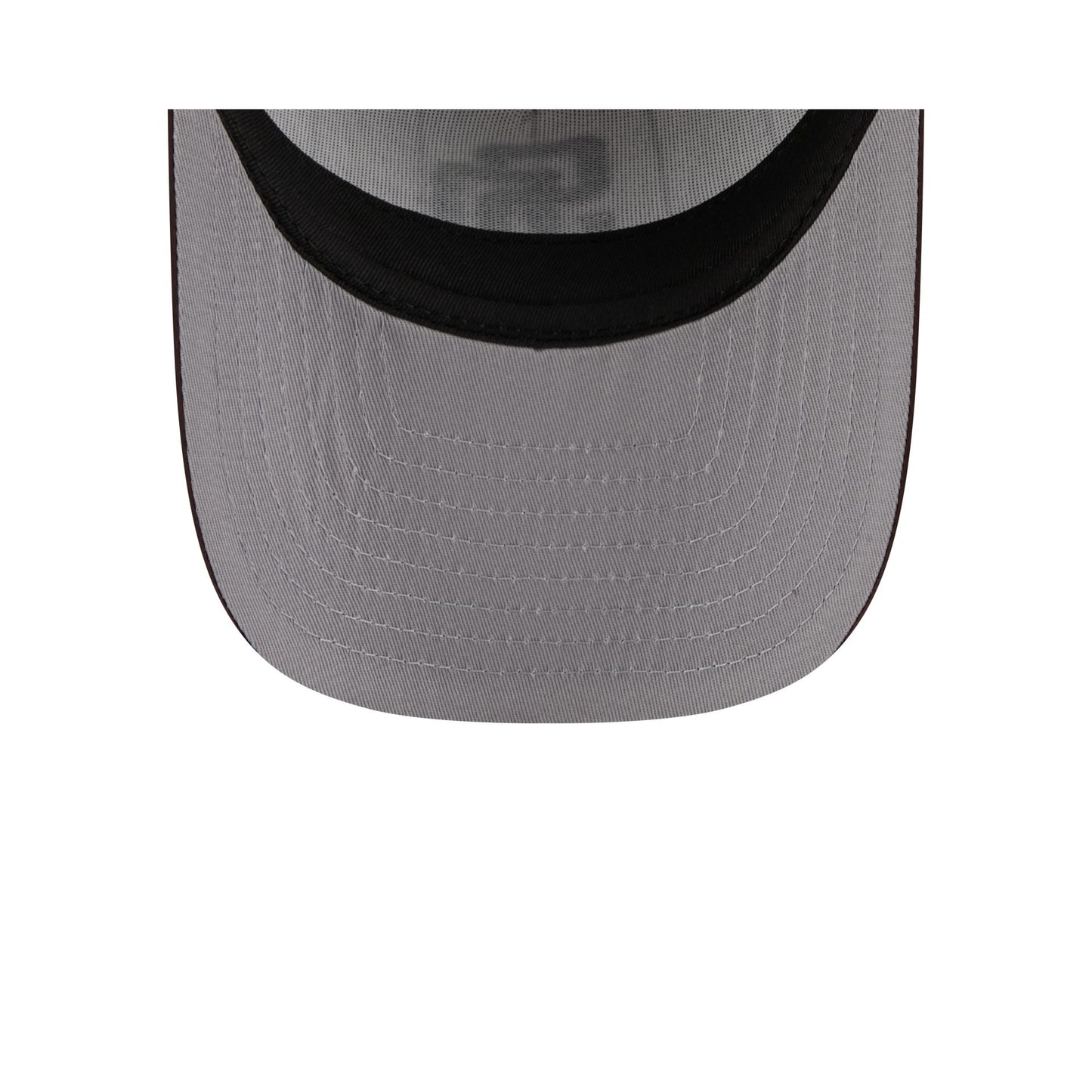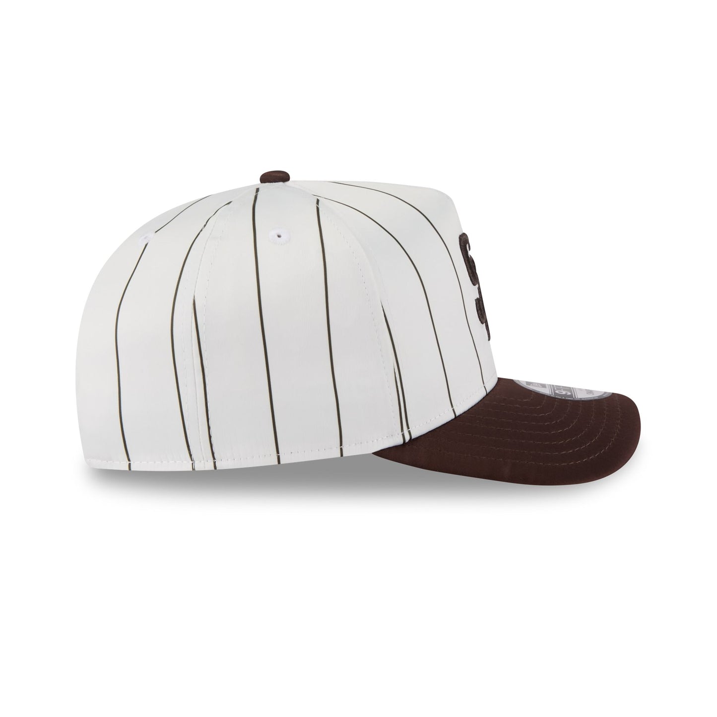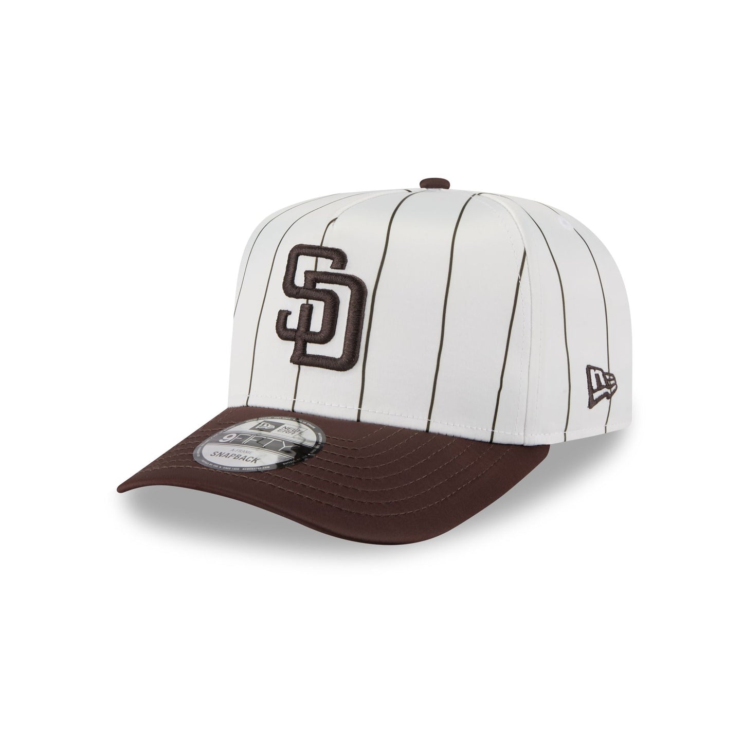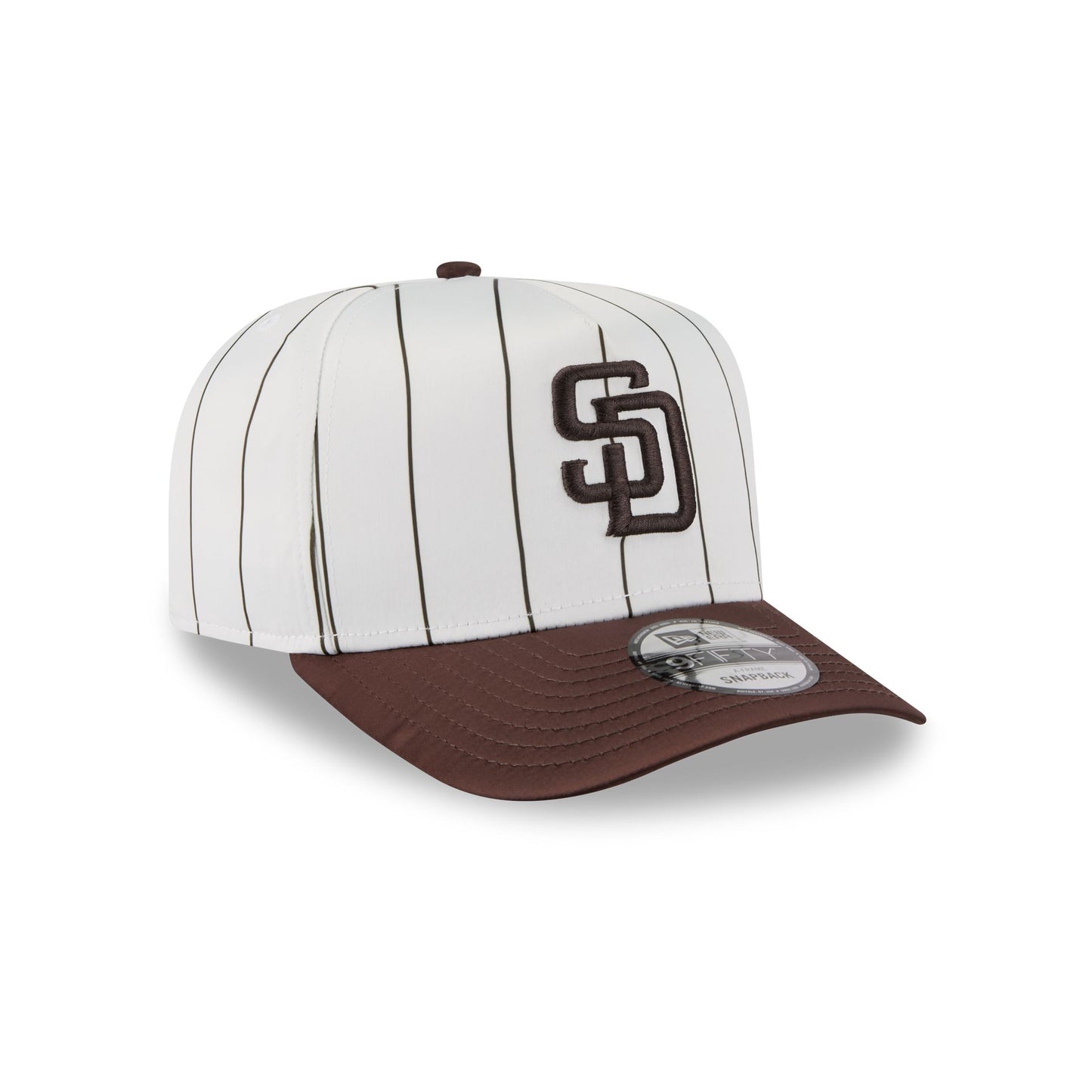 The San Diego Padres Satin Pinstripe 9FIFTY A-Frame Snapback features an embroidered Padres logo at the front panel with a team color visor, a gray undervisor, and a snapback closure at the rear.