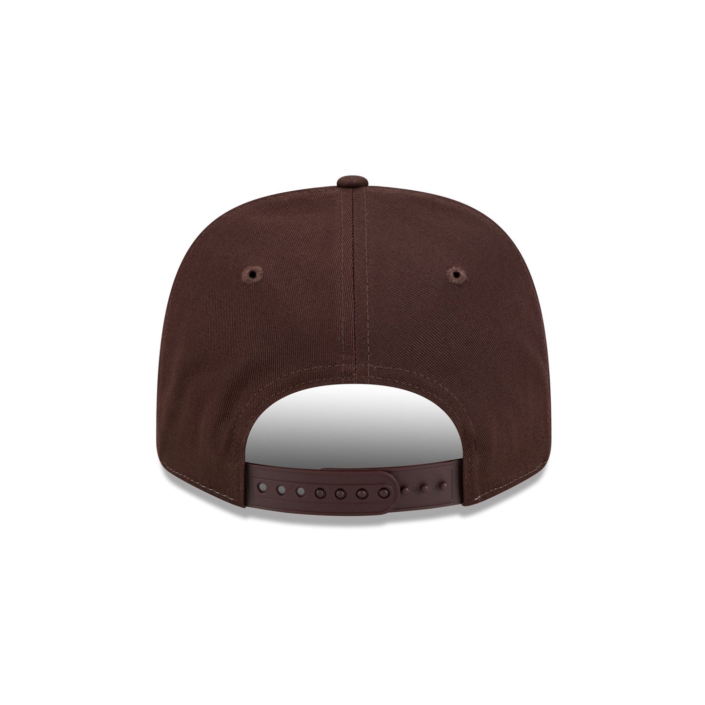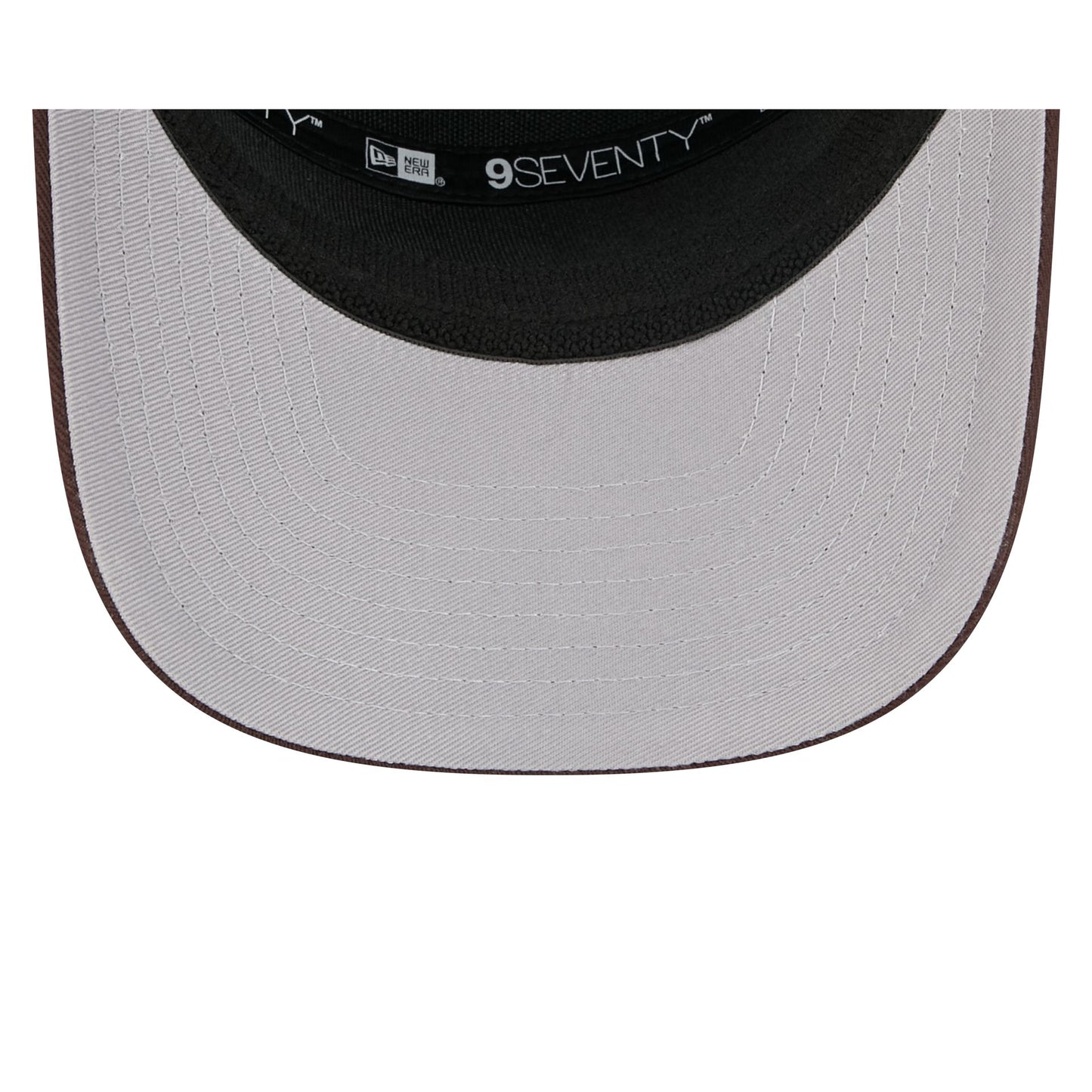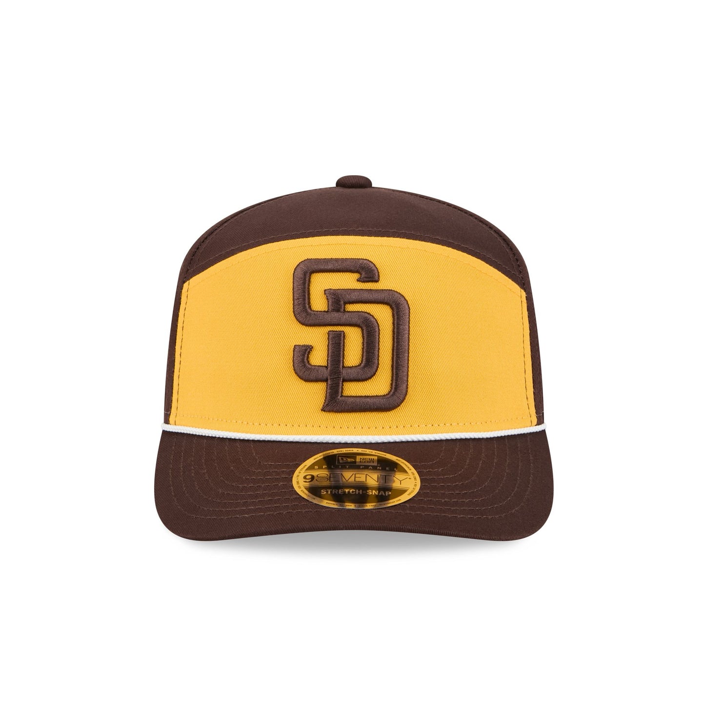 The San Diego Padres Split Panel 9SEVENTY Stretch-Snap features an embroidered Padres logo at the front panel with a split crown construction and a rope at the visor. Additional details include an adjustable stretch-snap closure at the rear and a gray undervisor.