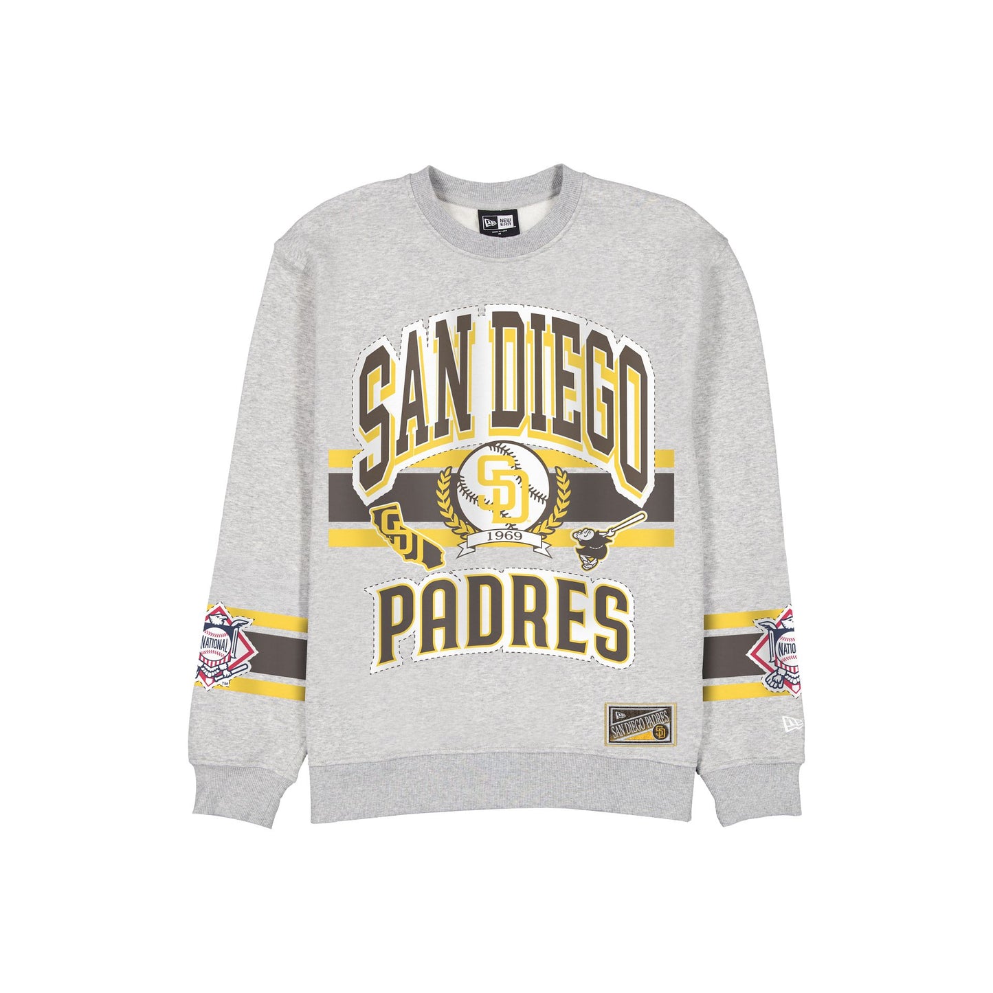 The San Diego Padres Sport Classics Vintage Gray Oversized Crewneck features a screen-printed Padres wordmark and graphic at the front with woven team jocktag at the bottom hem. Additional details include a National League logo with team color stripes at the sleeves.