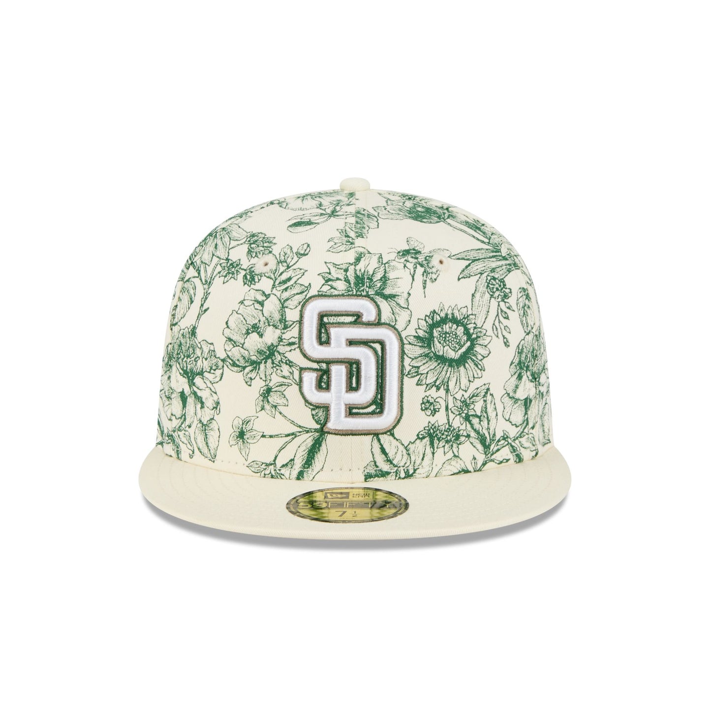 The San Diego Padres Spring Floral 59FIFTY Fitted Cap features an embroidered Padres logo at the front panels with a matching MLB Batterman logo at the rear and a chrome visor. Additional details include a floral print cotton twill all over fabrication and a 1984 World Series patch at the right-wear side.