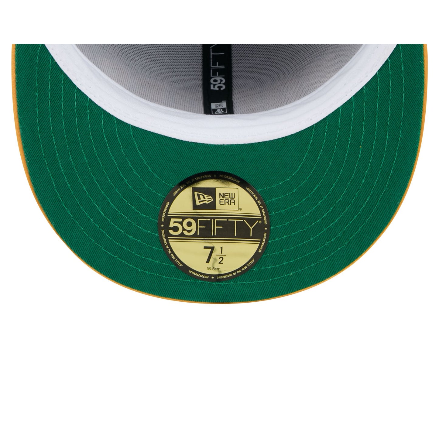 The San Diego Padres Spring Satin 59FIFTY Fitted Cap features an embroidered Padres wordmark at the front panels with a New Era pin at the top left panel and an MLB Batterman logo at the rear. Additional details include a satin fabrication throughout, a logo at the right-wear side, and a green undervisor.