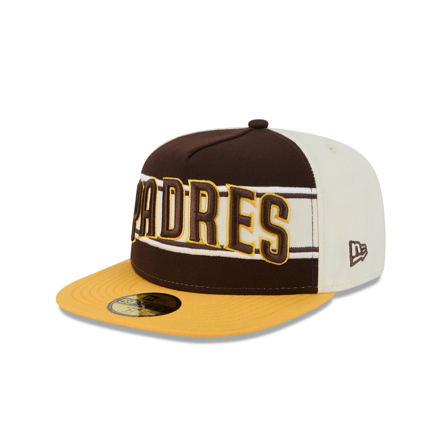 The San Diego Padres Summer Derby 59FIFTY A-Frame Fitted Cap features an embroidered Padres wordmark over team color stripes at the front panels with a matching MLB Batterman logo at the rear. Additional details include a 2016 All-Star Game patch at the right-wear side, a yellow visor, and a green undervisor.
