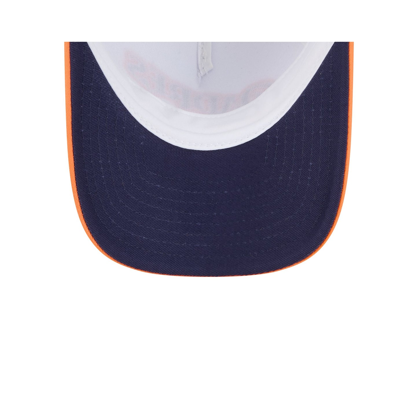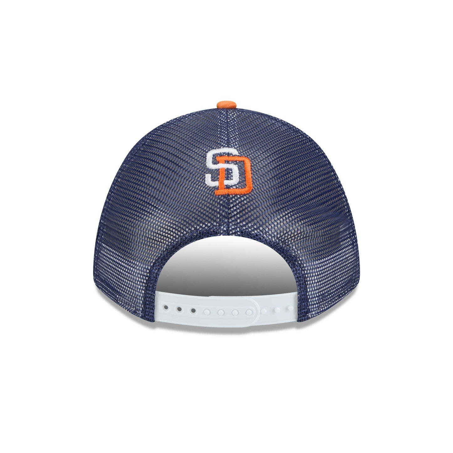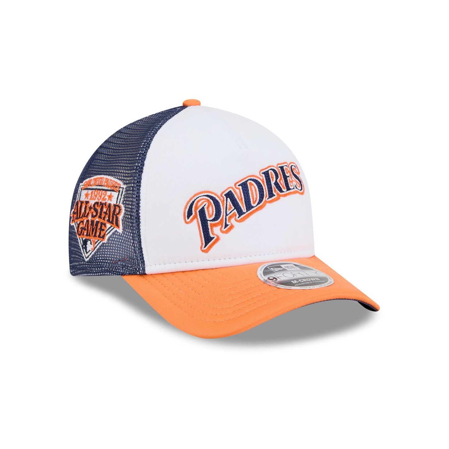 The San Diego Padres Summer Derby 9FORTY M-Crown A-Frame Snapback features an embroidered Padres Cooperstown wordmark at the front panel with a 1992 All-Star Game patch at the right-wear side. Additional details include a team logo above an adjustable snapback closure at the rear with an orange visor and a blue undervisor.