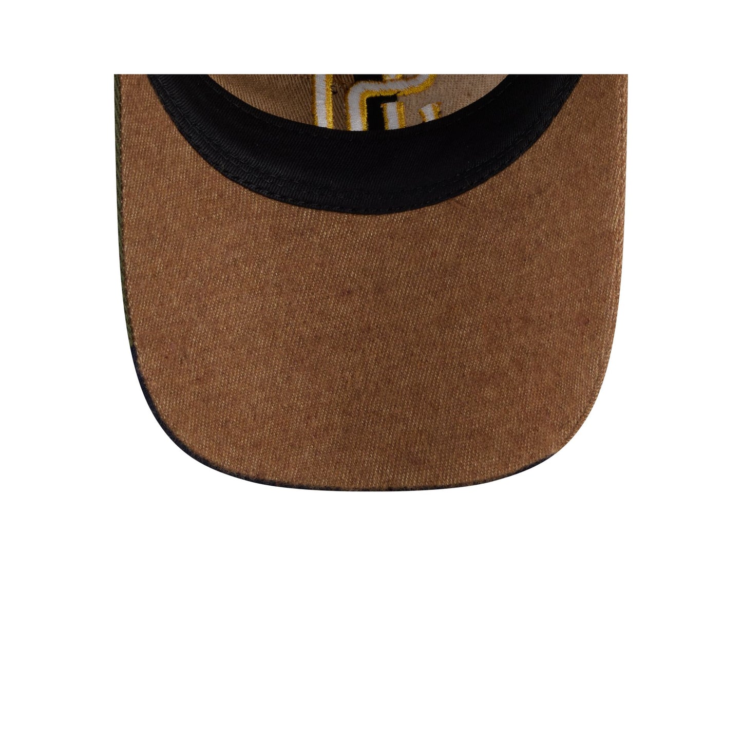 The San Diego Padres Three Looms Cotton Twill Patchwork 9TWENTY Adjustable Cap features an embroidered Padres logo at the front panels with a multi-colored patch fabrication, an adjustable buckle closure at the rear, and a brown undervisor.