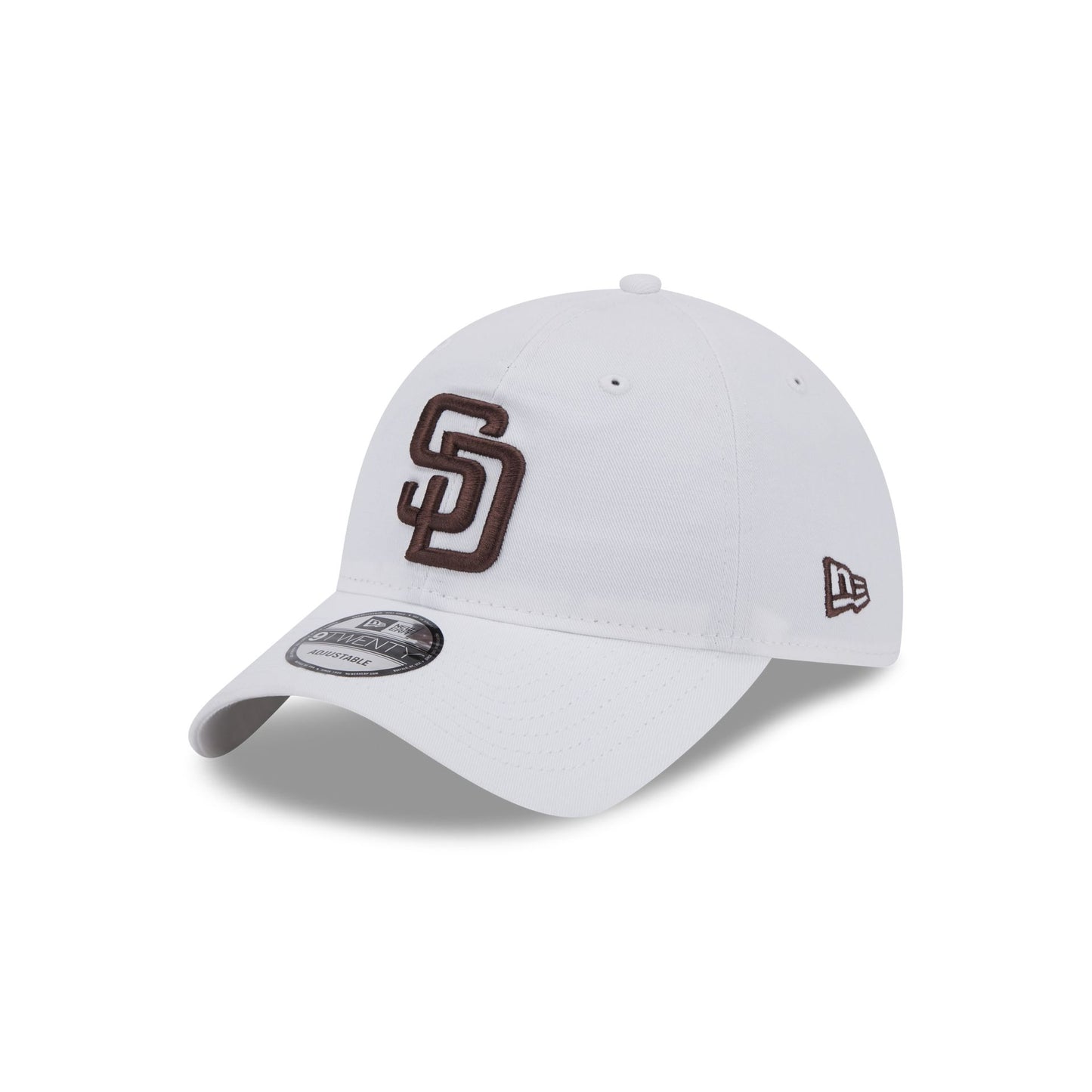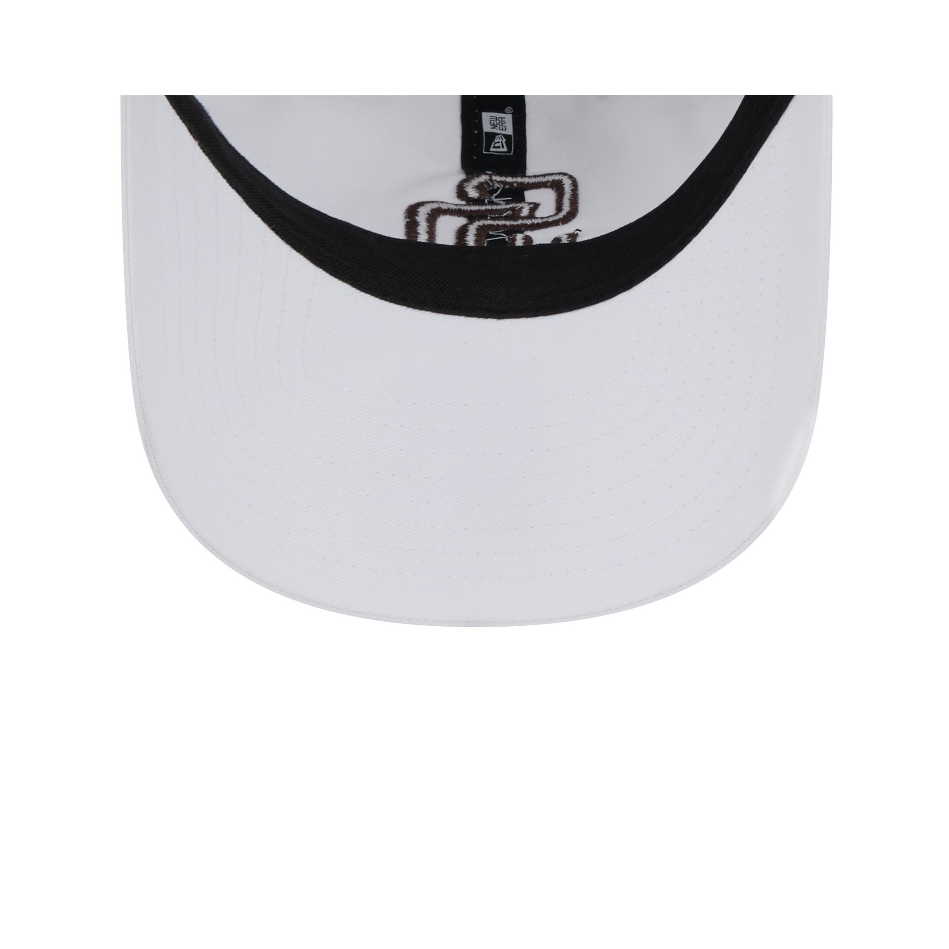 The San Diego Padres White 9TWENTY Adjustable Cap features an embroidered Padres logo at the front panels with a matching woven team logo tag at the adjustable D-Ring closure at the rear.