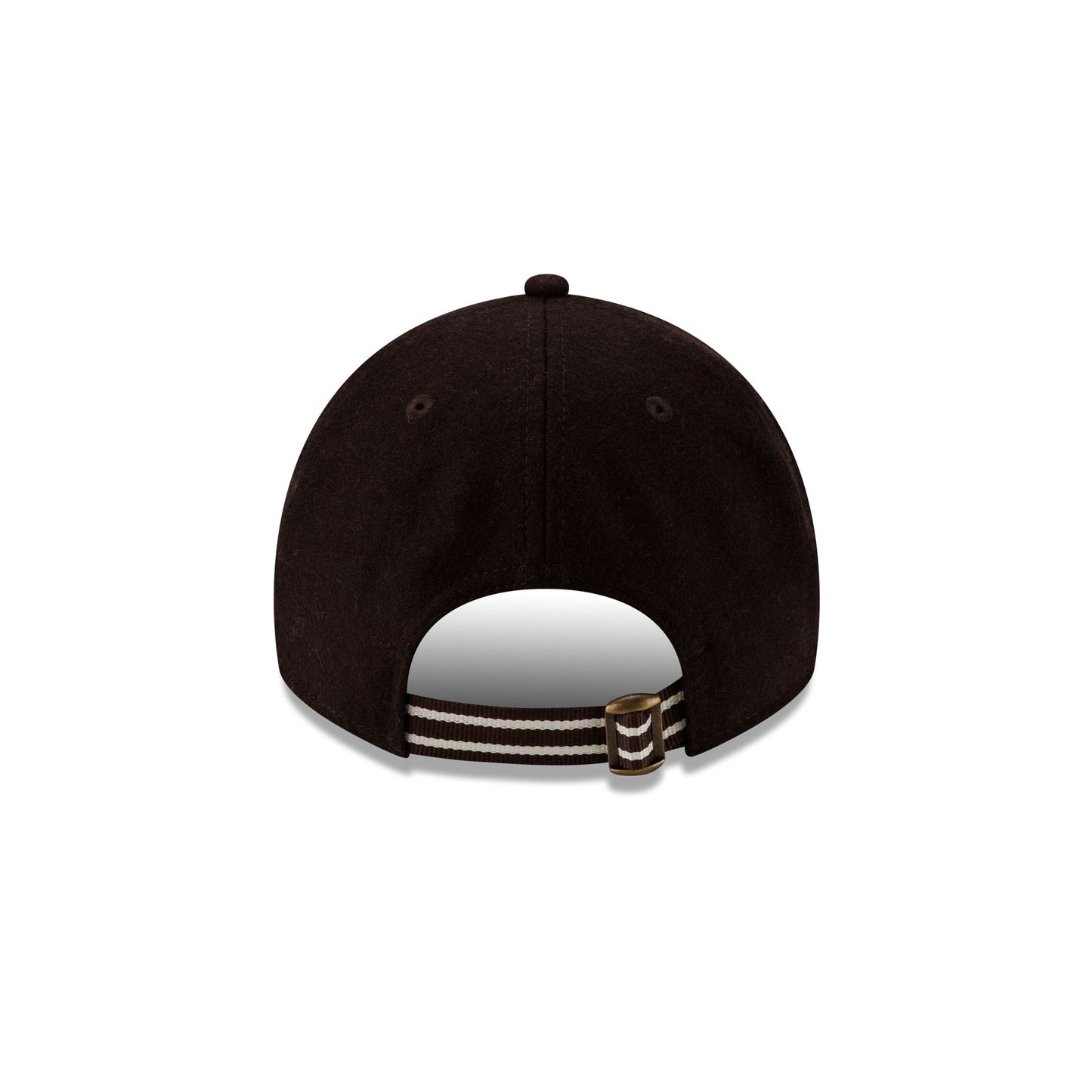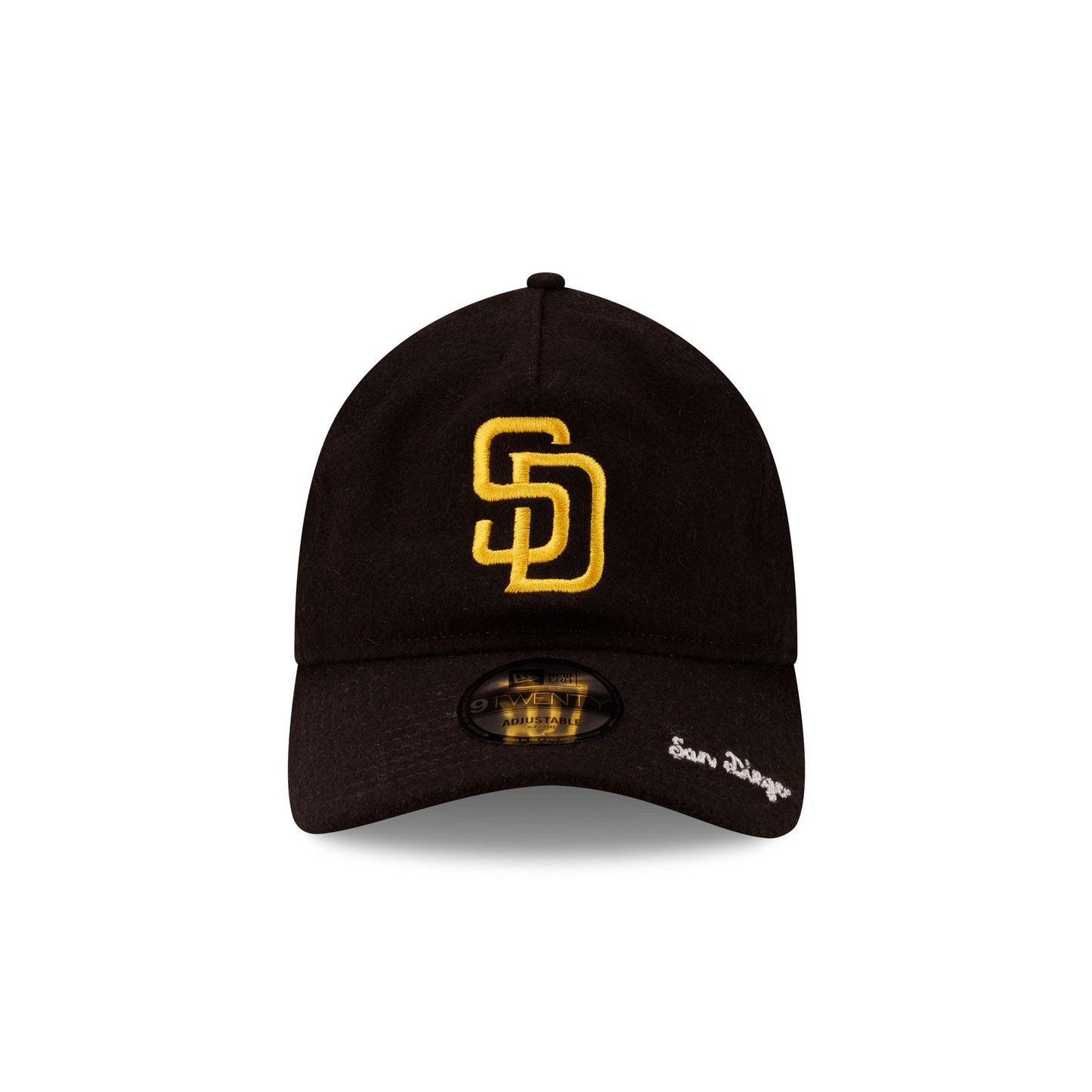 The San Diego Padres Wool Letterman 9TWENTY A-Frame Adjustable Cap features an embroidered Padres logo at the front panels against a wool fabrication throughout the cap. Additional details include an embroidered team script at the visor with a striped adjustable D-Ring closure at the rear and a green undervisor.