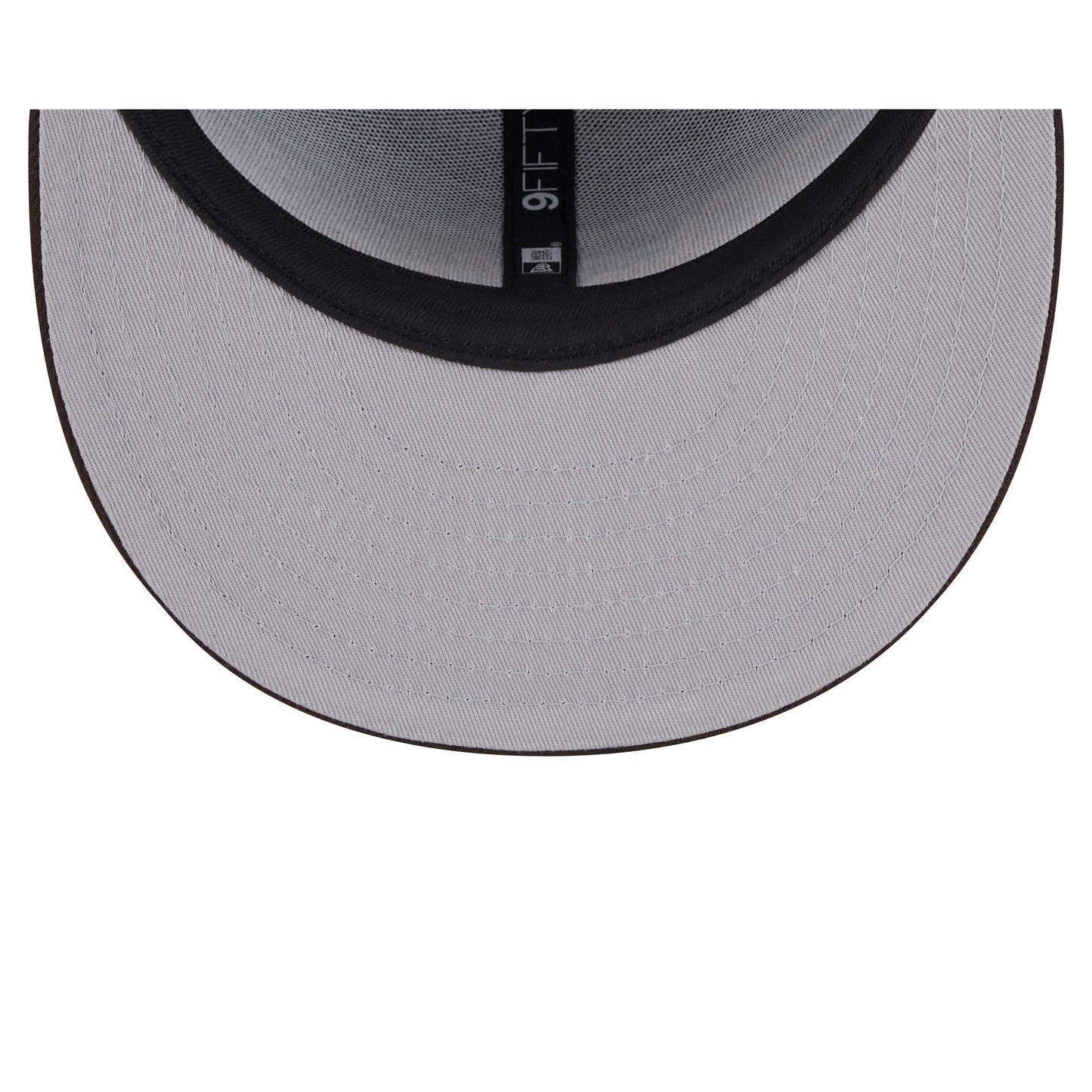 The San Diego Padres Wordmark 9FIFTY Snapback features an embroidered Padres wordmark at the front panels with a matching team logo at the right-wear side, a gray undervisor, and a snapback closure at the rear.