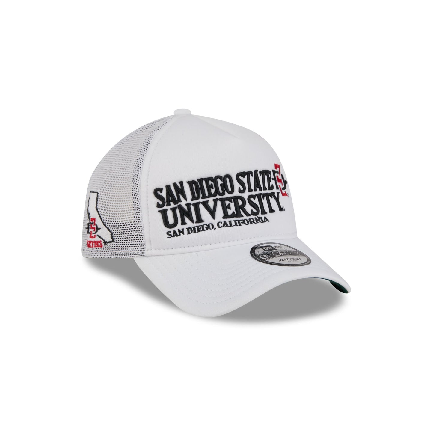 The San Diego State Aztecs Collegiate City, State 9FORTY A-Frame Trucker features an embroidered Aztecs wordmark and logo above a San Diego, California school location wordmark at the front panel. Additional details include an alternate team logo and City, State patch at the right-wear side with an adjustable snapback closure at the rear and a green undervisor.