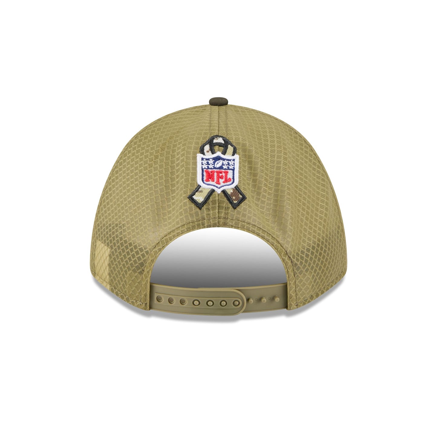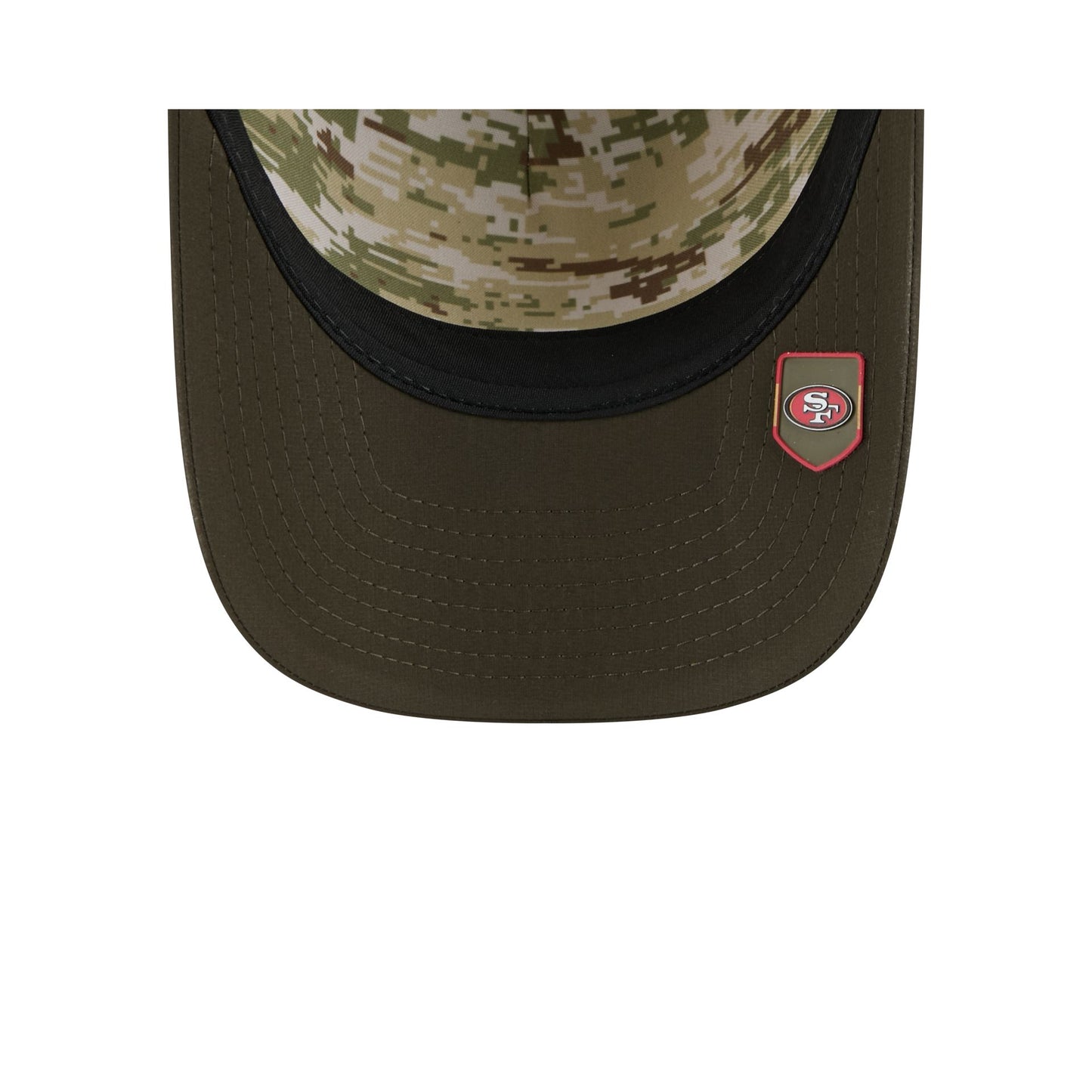 The San Francisco 49ers 2025 Salute to Service 9FORTY M-Crown A-Frame Trucker features an embroidered 49ers logo at the front panel with the official NFL Salute to Service patch above a snapback closure at the rear. Additional details include an American flag patch at the right-wear side with a silicone team logo patch at a dark green undervisor and a digi camo interior fabrication.