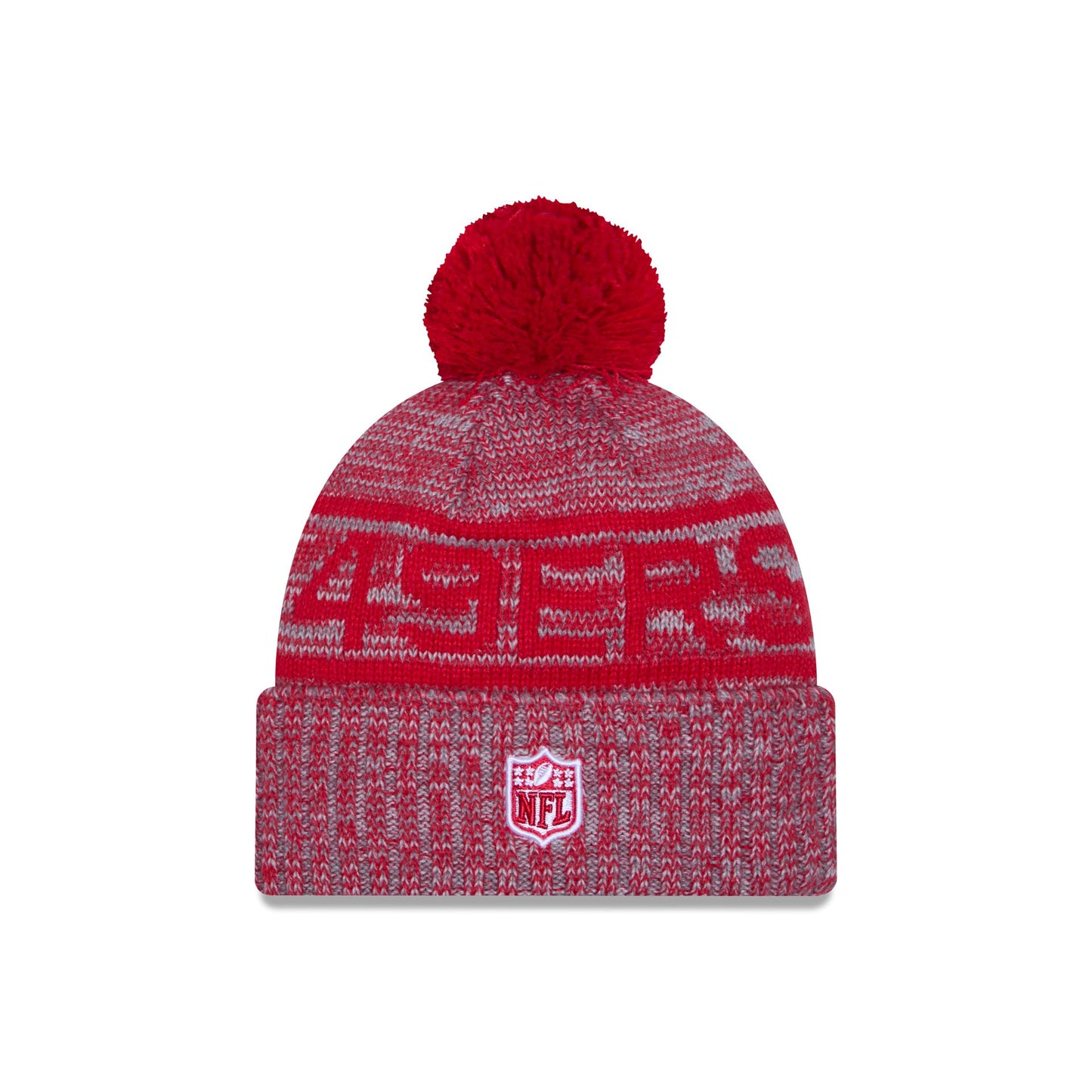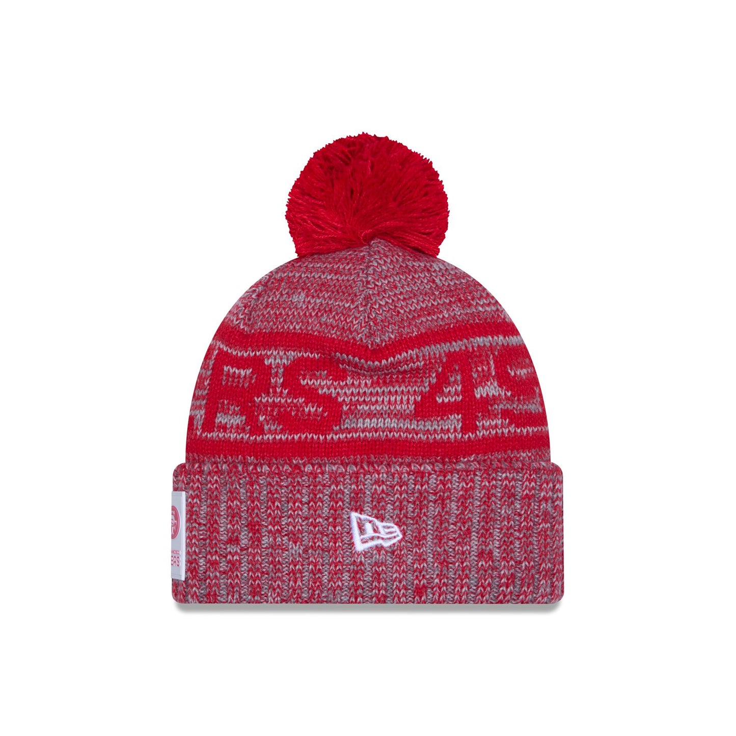 The San Francisco 49ers 2025 Sideline Cold Weather Gray Pom Knit Hat features a sewn-down silicone 49ers white logo patch at the front cuff with a matching Official NFL Shield logo at the rear. Additional details include a team wordmark across the crown, a one-time removeable pom, and a fleece lining.