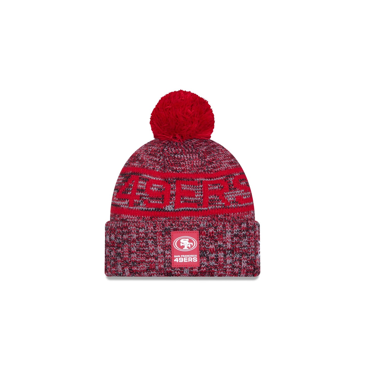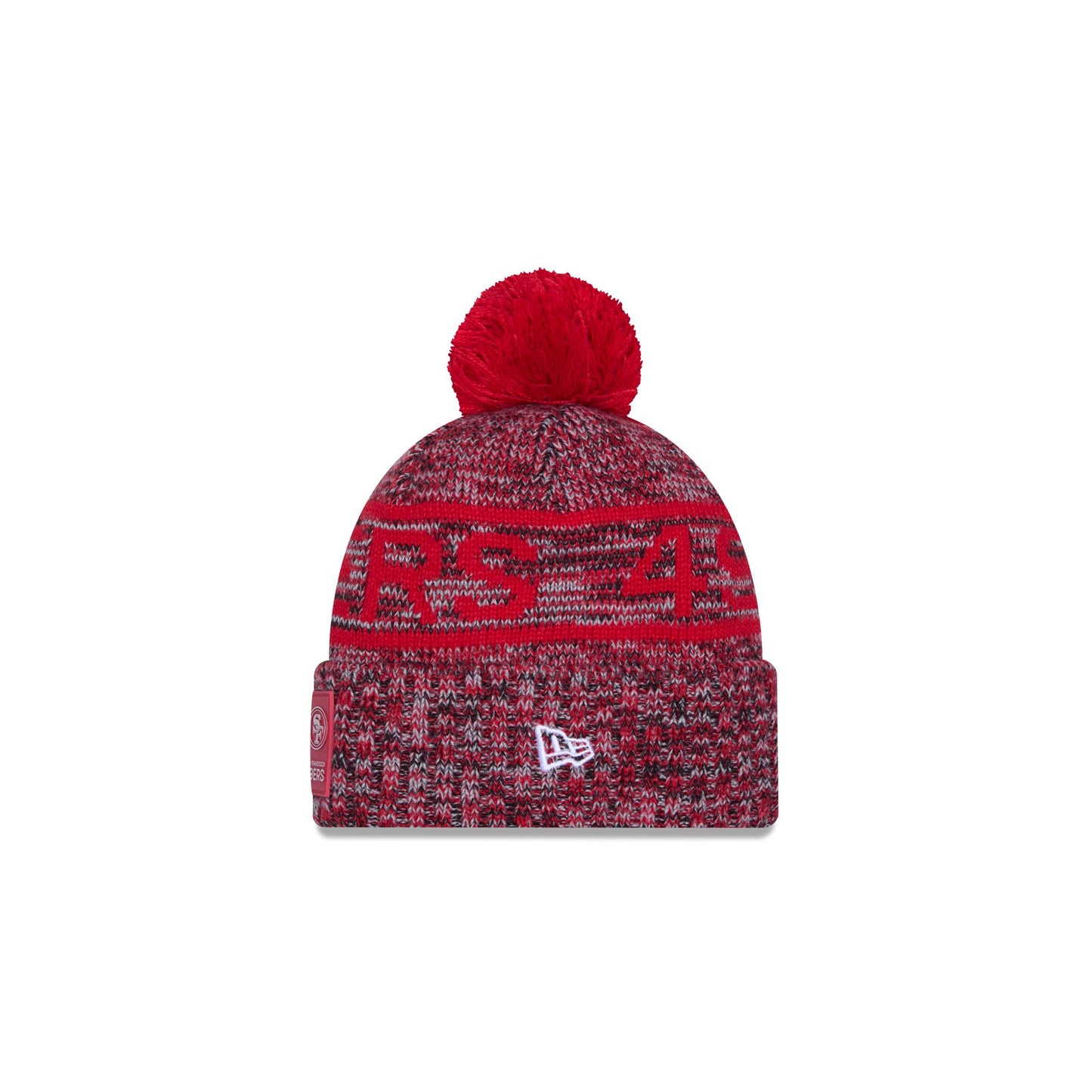 The San Francisco 49ers 2025 Sideline Cold Weather Kids Pom Knit features a sewn-down silicone 49ers logo patch at the front cuff with a matching Official NFL Shield logo at the rear. Additional details include a team wordmark across the crown, a one-time removeable pom, and a fleece lining.