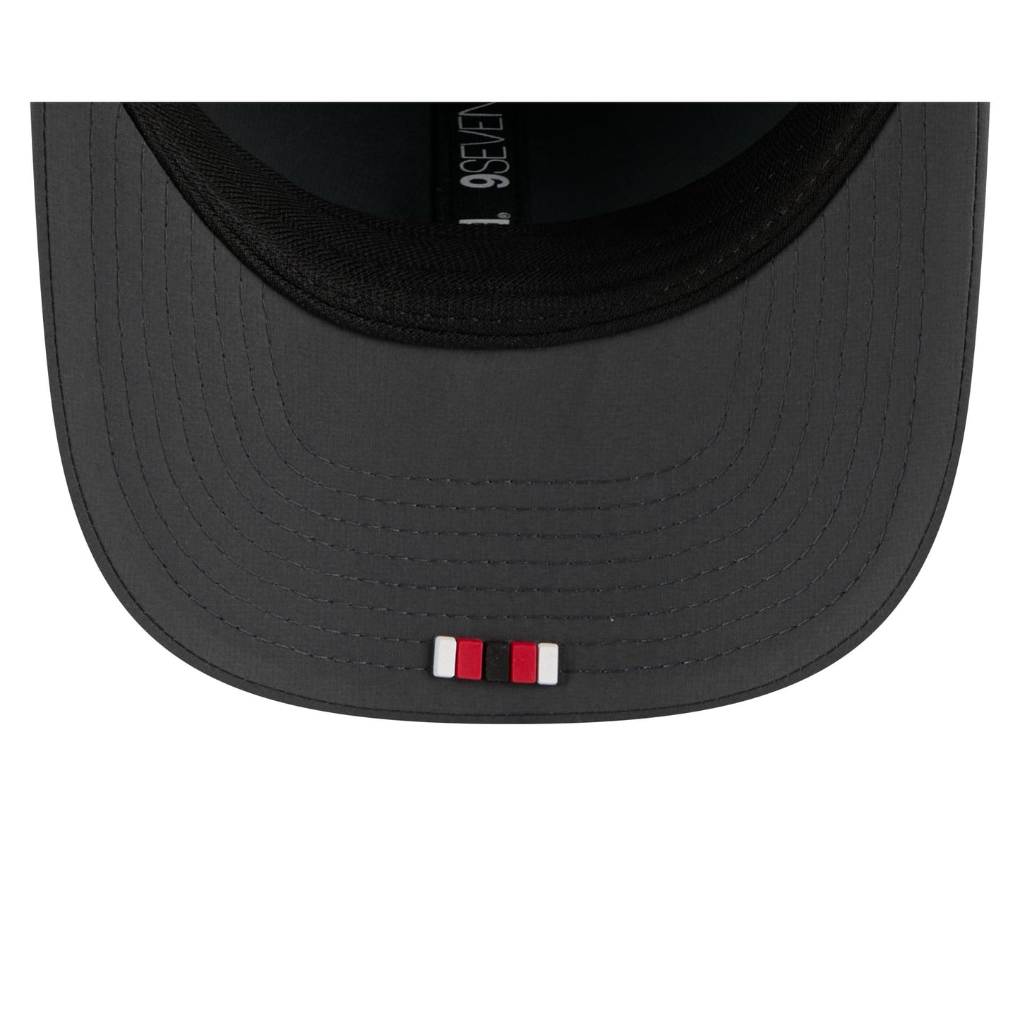 The San Francisco 49ers 2025 Sideline Cold Weather Steel Clouds 9SEVENTY Stretch-Snap features a sewn-down silicone 49ers logo patch at the front panels with a water-repellent quill tech fabrication throughout and an insulated crown with a quick-dry cushioned sweatband. Additional details include the Official NFL Shield logo to the right of a soft silicone snapback closure at the rear. The undervisor is accented with a silicone transfer in the team’s colors.
