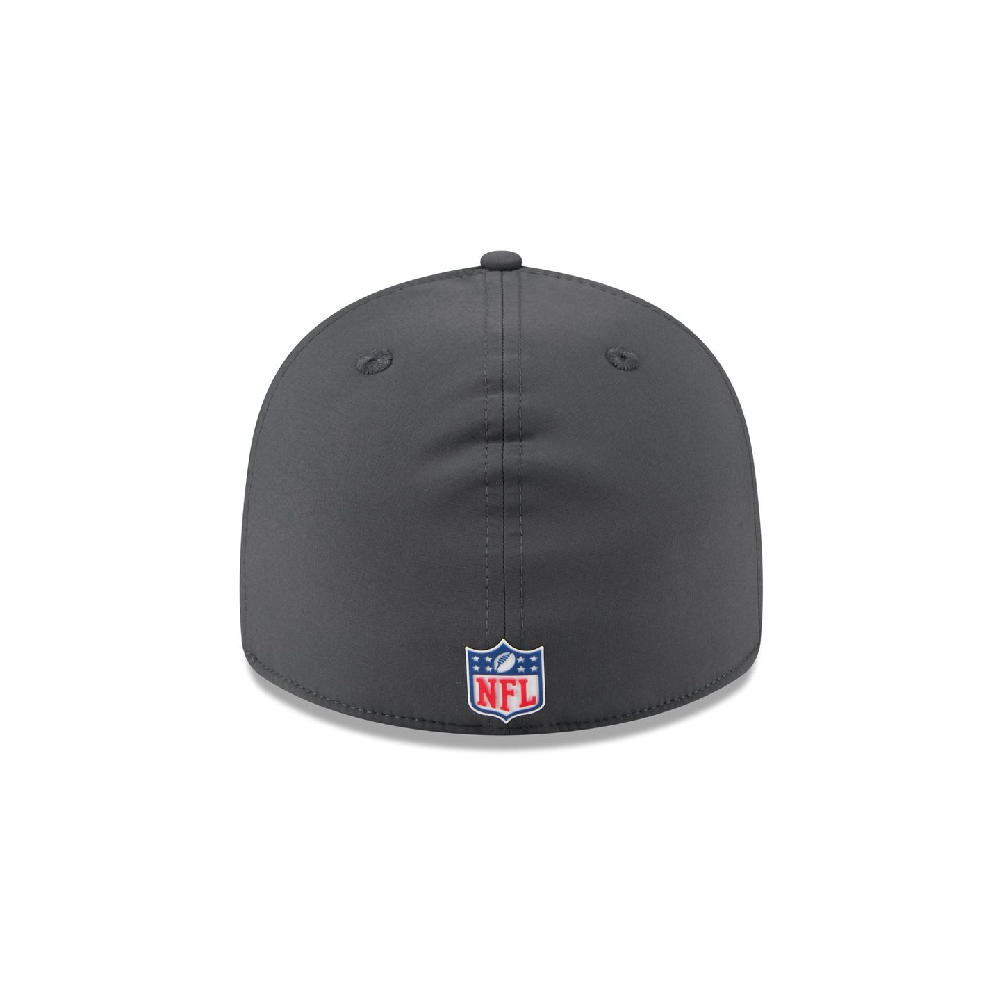 The San Francisco 49ers 2025 Sideline Cold Weather Steel Clouds Retro Crown 59FIFTY A-Frame Fitted Cap features a sewn-down silicone 49ers logo patch at the front panels with the Official NFL Shield logo at the rear. The cap has a water-repellent quill tech fabrication throughout, with an insulated crown and quick-dry cushioned sweatband. The undervisor is accented with a silicone transfer in the team’s colors.