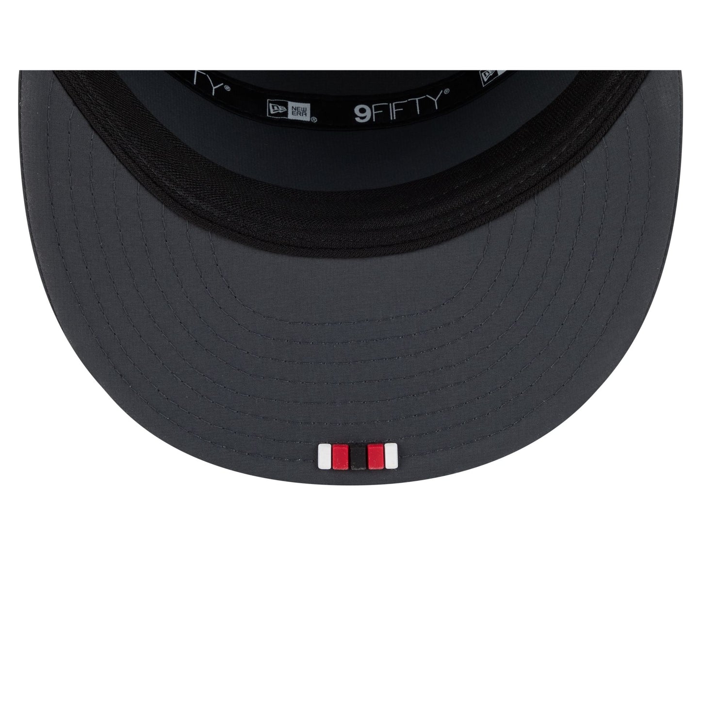 The San Francisco 49ers 2025 Sideline Cold Weather Steel Clouds Split Panel 9FIFTY Snapback features a sewn-down silicone 49ers logo patch at the front panels with a split-crown construction and diamond quilting. The cap has a water-repellent quill tech fabrication throughout, with a quick-dry cushioned sweatband to absorb moisture. Additional details include the Official NFL Shield logo to the right of a soft silicone snapback closure at the rear with eyelets at each side panel. The undervisor is accented with a silicone transfer in the team’s colors.