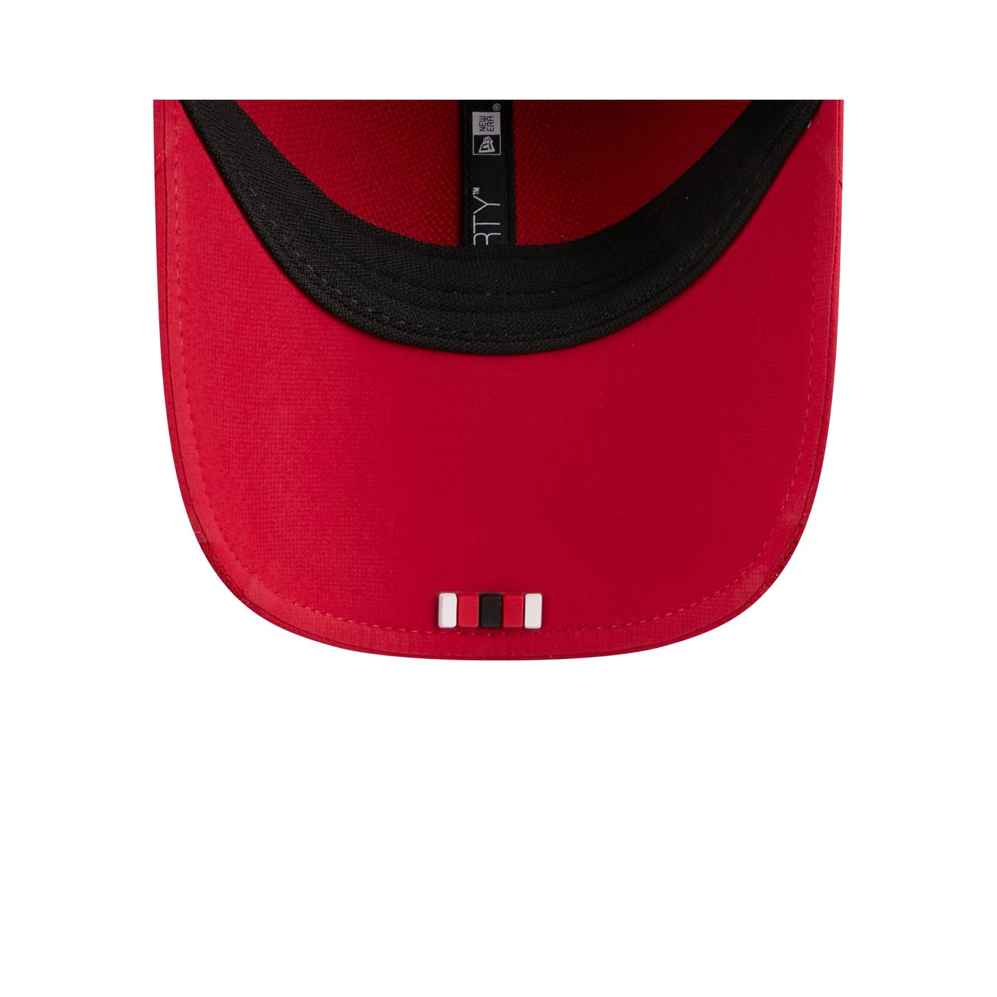 The San Francisco 49ers 2025 Sideline Hot Weather 9FORTY M-Crown Snapback features a sewn-down silicone 49ers logo patch at the front panels with a water-repellent quill tech fabrication throughout and a quick-dry cushioned sweatband to absorb moisture. Additional details include the Official NFL Shield logo to the right of a soft silicone snapback closure at the rear and mesh accents at the visor sides and side crown panels. The undervisor is accented with a silicone transfer in the team’s colors.