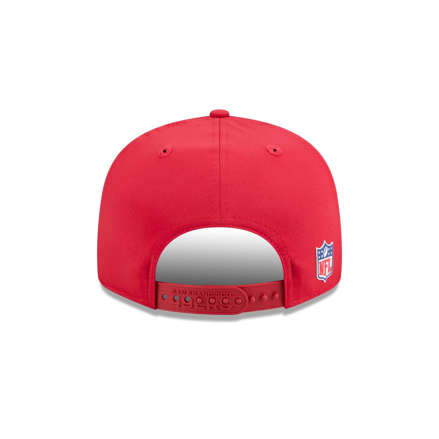The San Francisco 49ers 2025 Sideline Hot Weather Split Panel 9FIFTY Snapback features a sewn-down silicone 49ers logo patch at the front panels with a split-crown construction. The cap has a water-repellent quill tech fabrication throughout, with a quick-dry cushioned sweatband to absorb moisture. Additional details include the Official NFL Shield logo to the right of a soft silicone snapback closure at the rear. The undervisor is accented with a silicone transfer in the team’s colors.