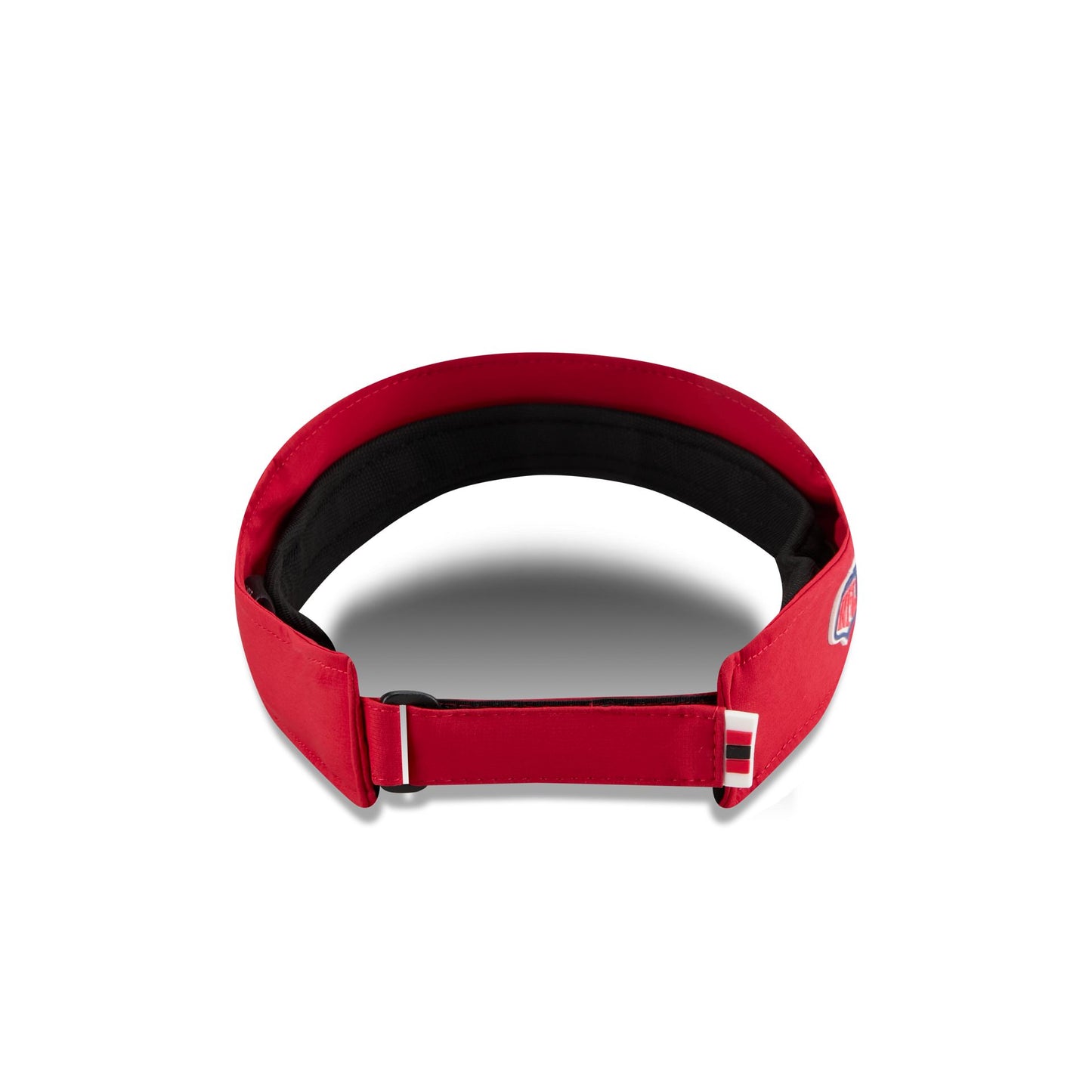 The San Francisco 49ers 2025 Sideline Hot Weather Visor Adjustable Cap features a sewn-down silicone 49ers logo patch at the front panel with a water-repellent quill tech fabrication throughout and a quick-dry cushioned sweatband to absorb moisture. Additional details include the Official NFL Shield logo to the right of an adjustable hook-and-loop closure at the rear. The closure is accented with mesh a silicone transfer in the team’s colors.