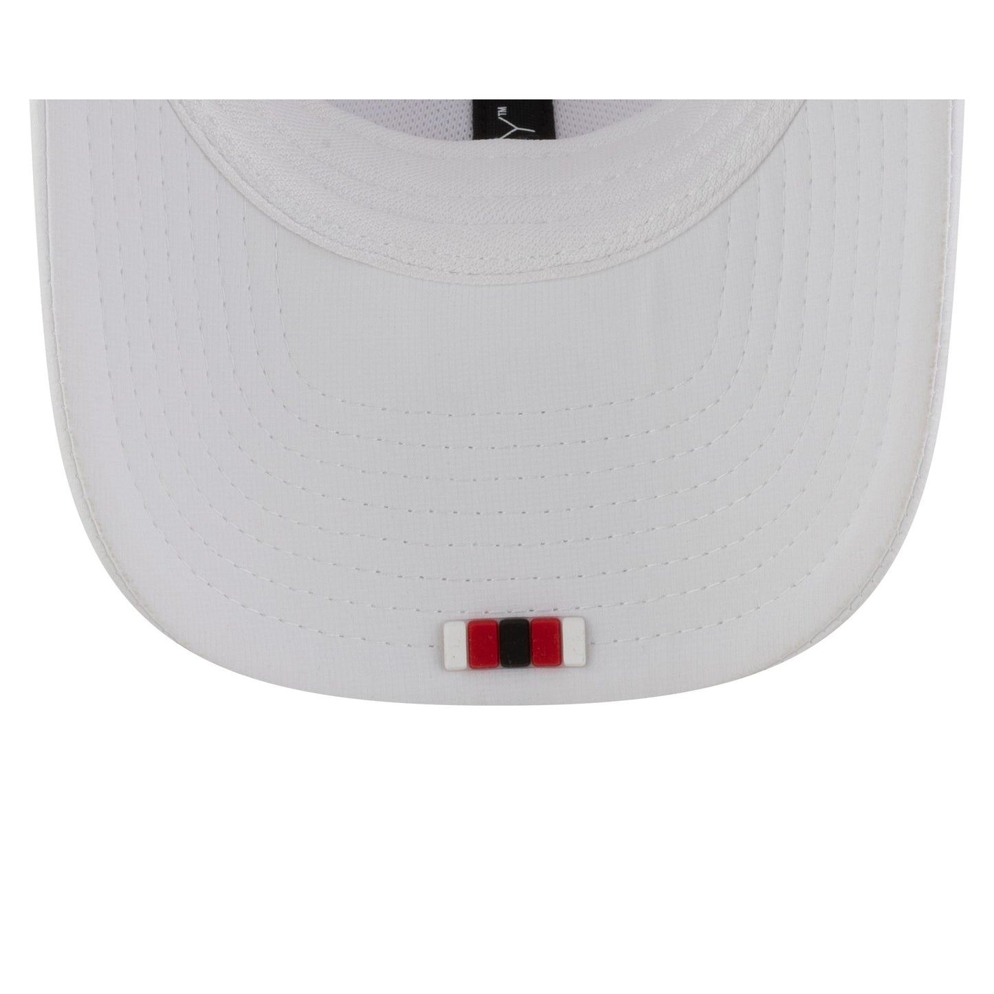 The San Francisco 49ers 2025 Sideline Hot Weather White 9SEVENTY Trucker features a sewn-down silicone 49ers logo patch at the front panels with a water-repellent quill tech fabrication throughout and a quick-dry cushioned sweatband to absorb moisture. Additional details include the Official NFL Shield logo to the right of a soft silicone snapback closure at a light-weight mesh rear. The undervisor is accented with a silicone transfer in the team’s colors.
