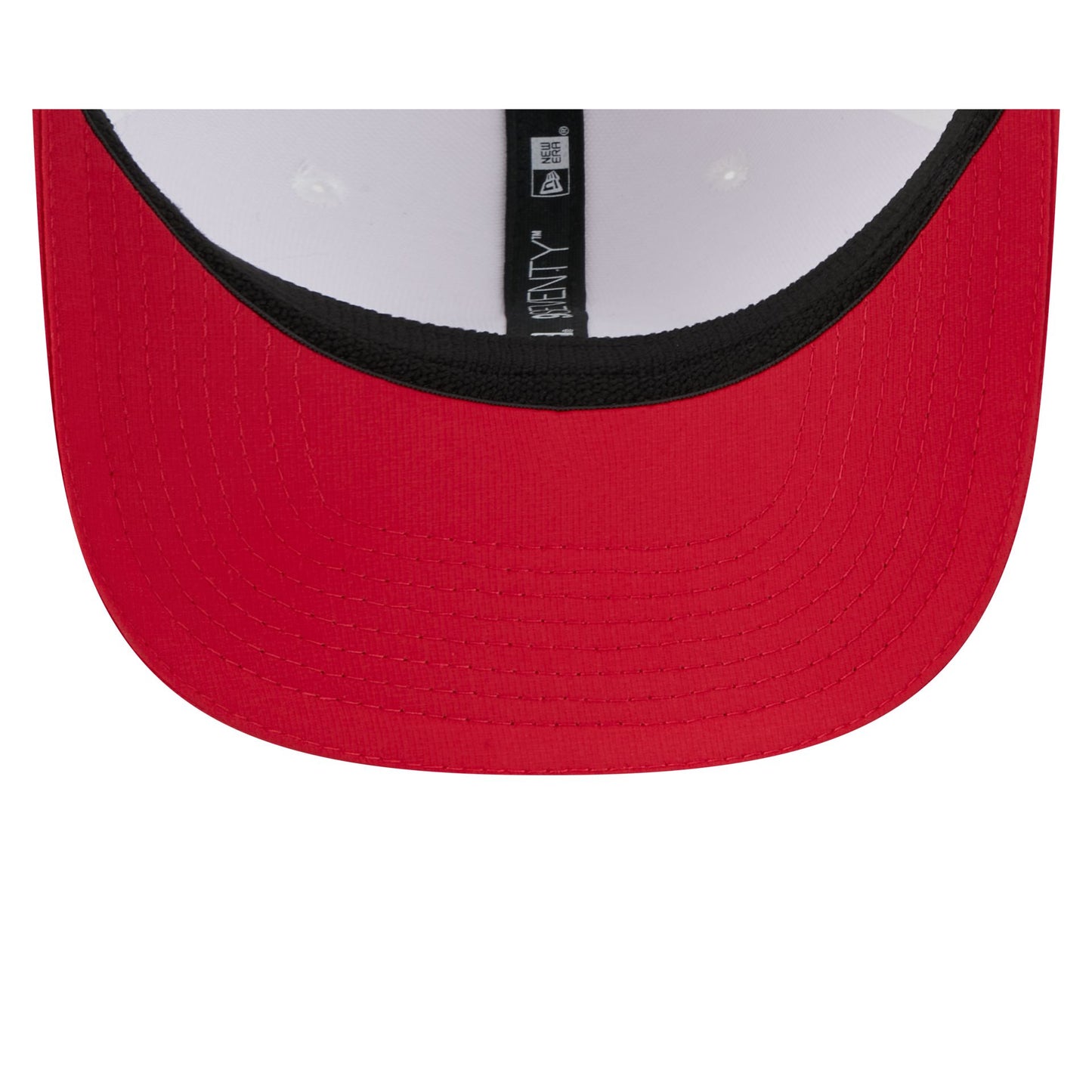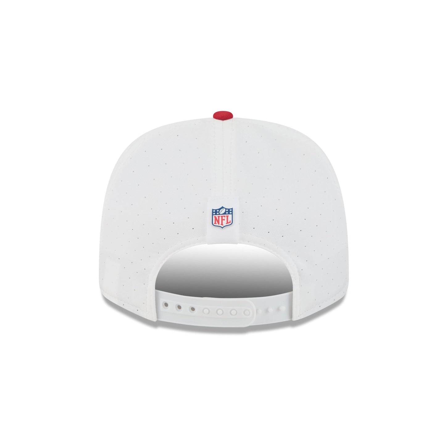 The San Francisco 49ers 2025 Training 9SEVENTY Stretch-Snap Cap features a silicone 49ers patch at the front panels with team color stripes at the front of a red visor. Additional details include a silicone NFL Shield patch on a woven foldover tab above a snapback closure at the rear.