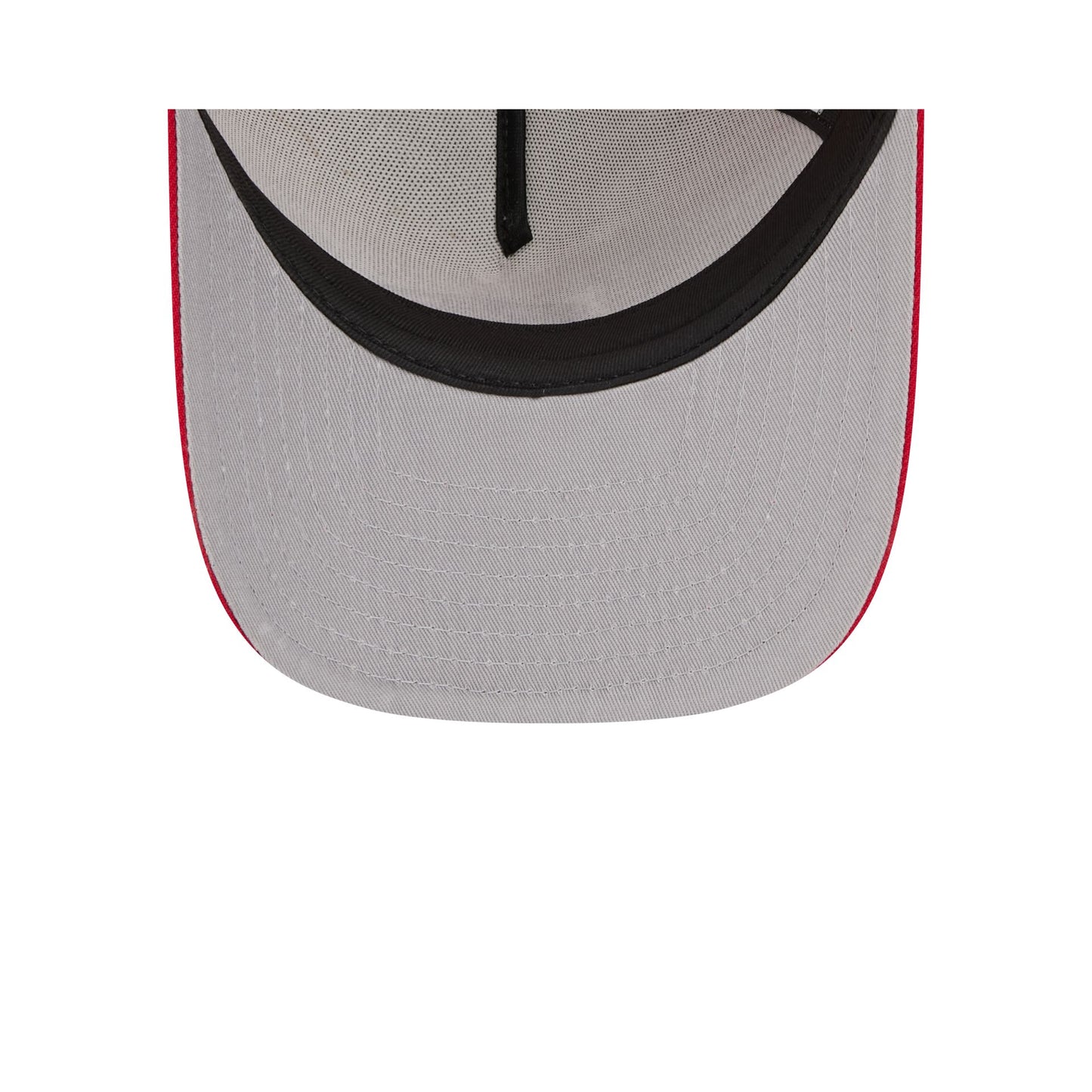 The San Francisco 49ers Banner 9FIFTY A-Frame Trucker features a embroidered 49ers logo at the front panels against a screen-printed stripe at the front panels. Additional details include a snapback closure at a mesh rear and a gray undervisor.