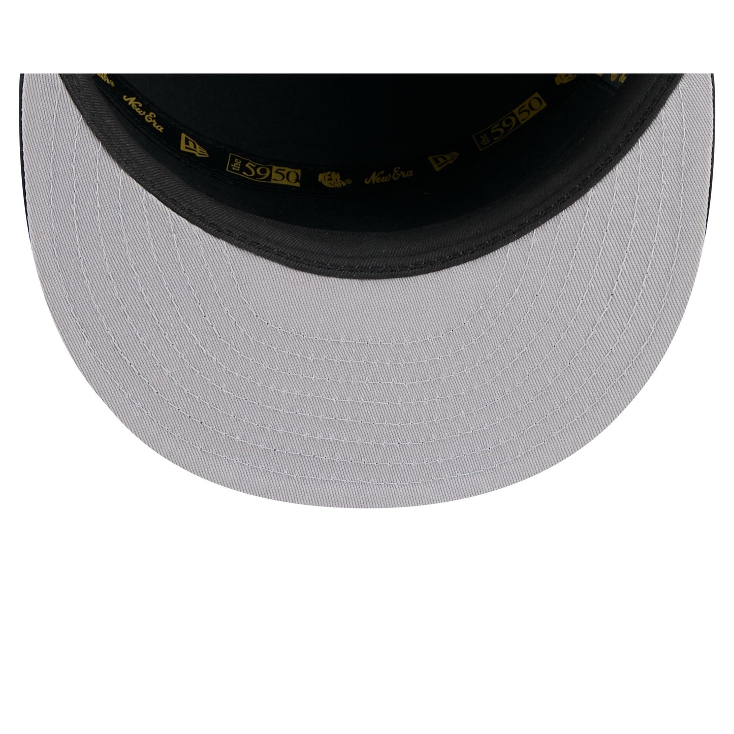 The San Francisco 49ers Black Poly Rope 59FIFTY Split Panel Fitted Cap features a woven 49ers logo at the front panels with a matching NFL Shield logo embroidered at the rear. Additional details include a rope at the visor and a gray undervisor.