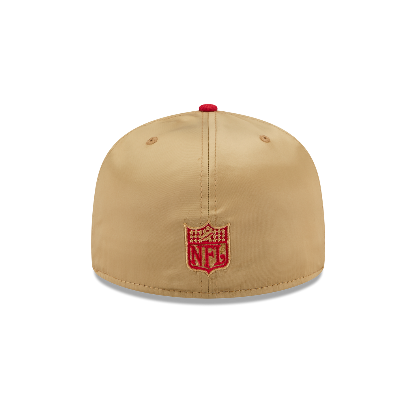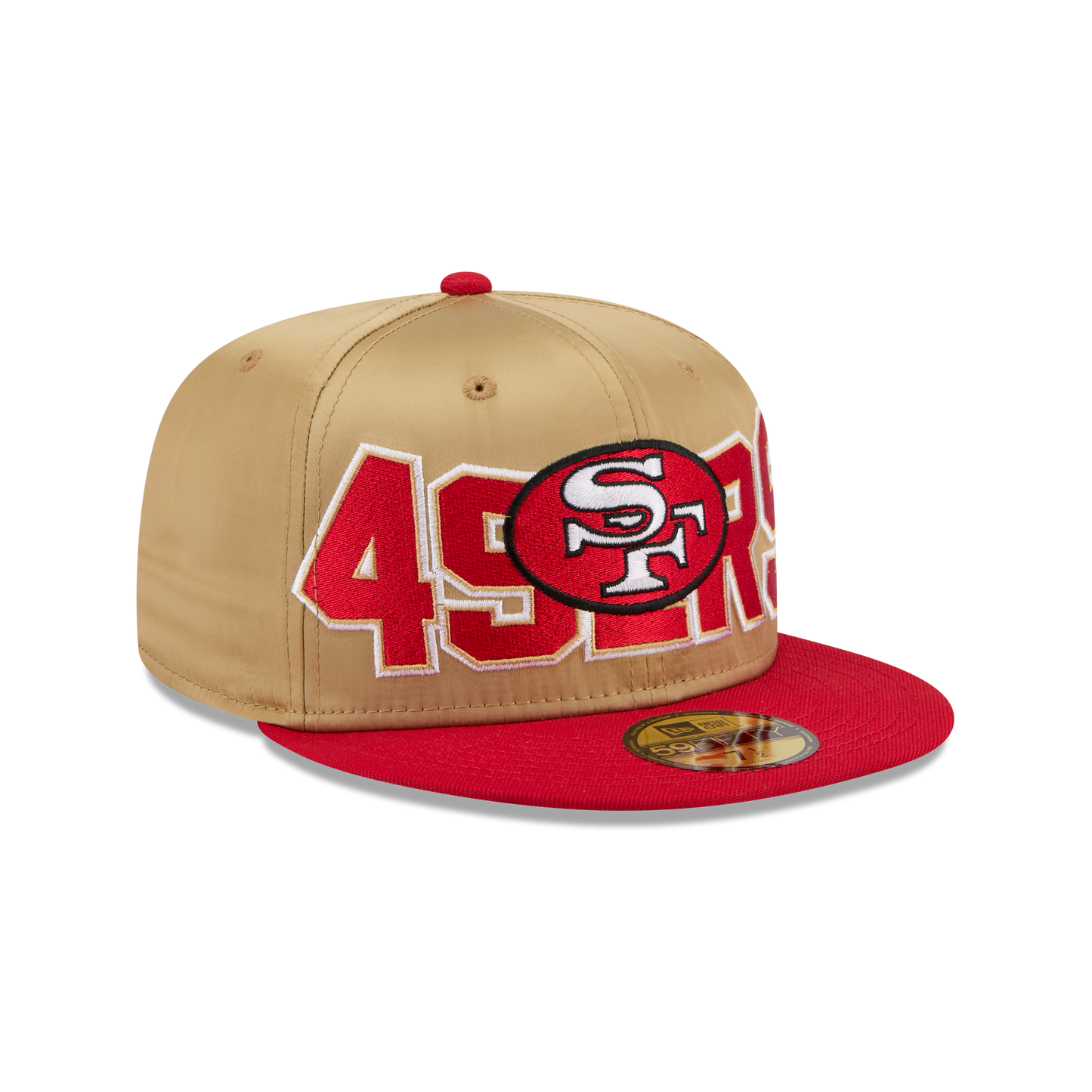 The San Francisco 49ers Bold Satin 59FIFTY Fitted Cap features an embroidered satin 49ers Historic graphic at the front panels with a satin fabrication throughout. Additional details include a matching NFL Shield logo at the rear and a gray undervisor.