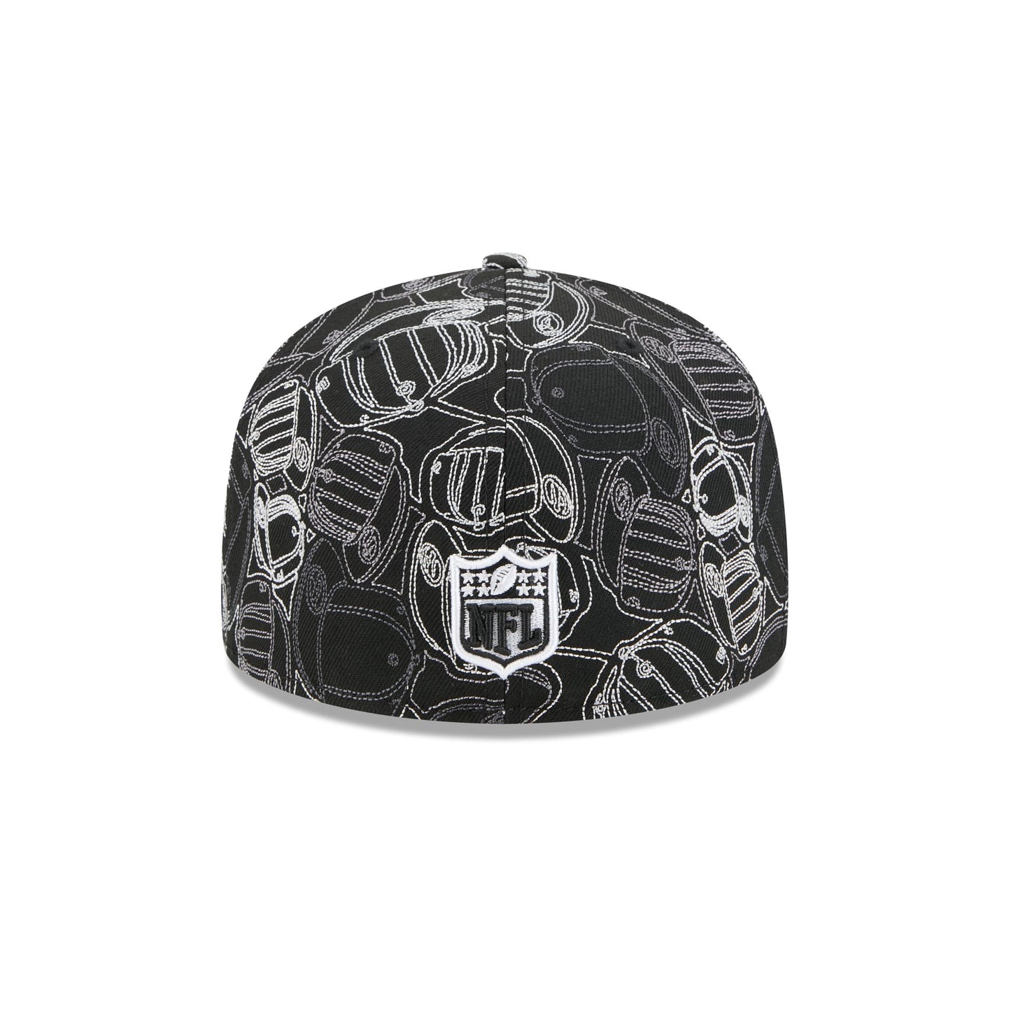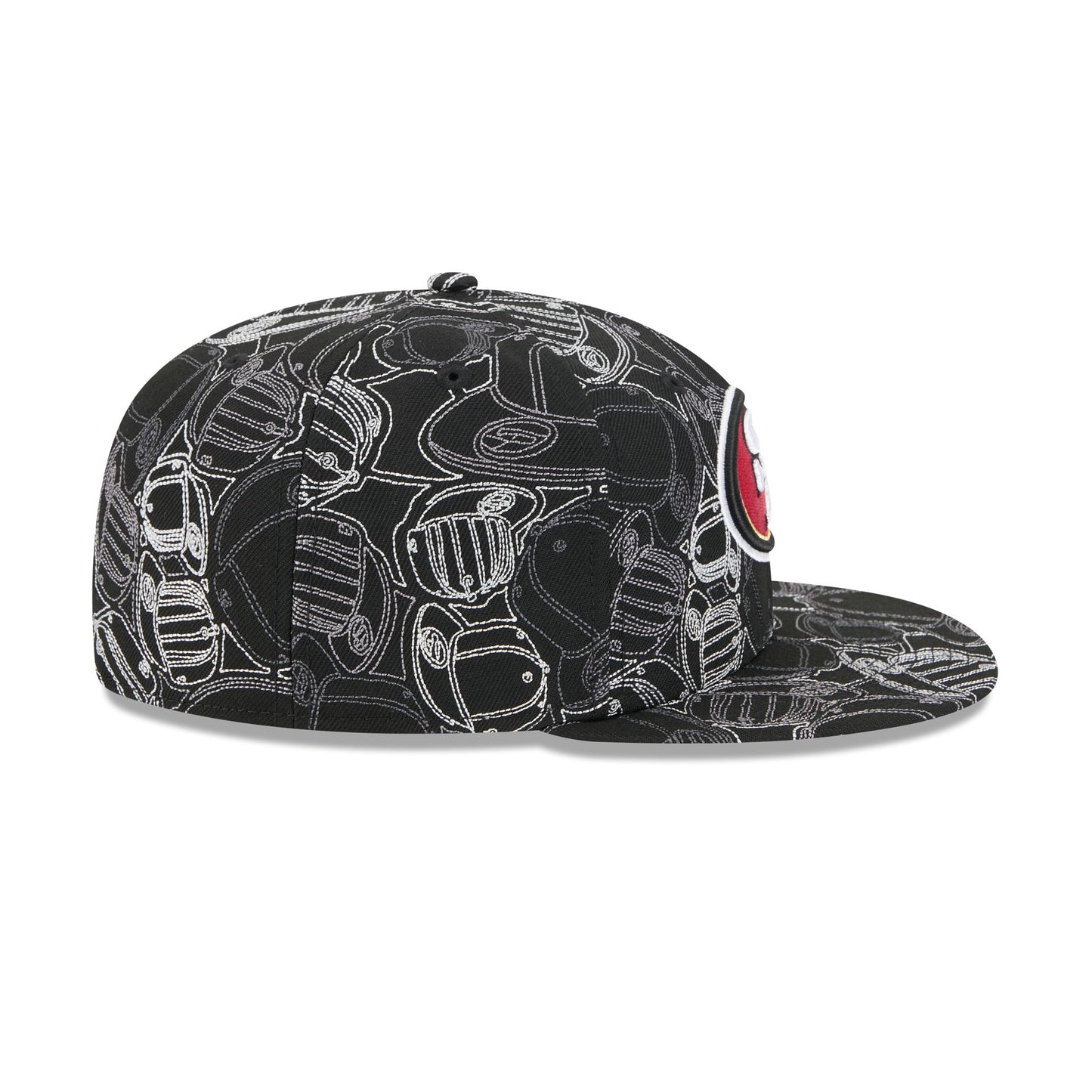 The San Francisco 49ers Cap Scramble 59FIFTY Fitted Cap features an embroidered 49ers logo at the front panels with chainstitched allover cap patterned fabrication, an NFL Shield at the rear, and a gray undervisor.
