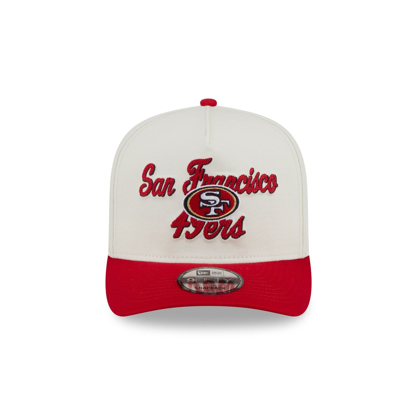 The San Francisco 49ers Chainstitch 9FIFTY A-Frame Snapback features a chainstitch 49ers logo and script wordmark at the front panels with a snapback closure at the rear and a gray undervisor.